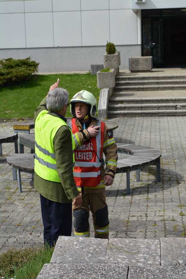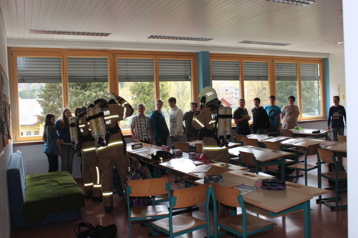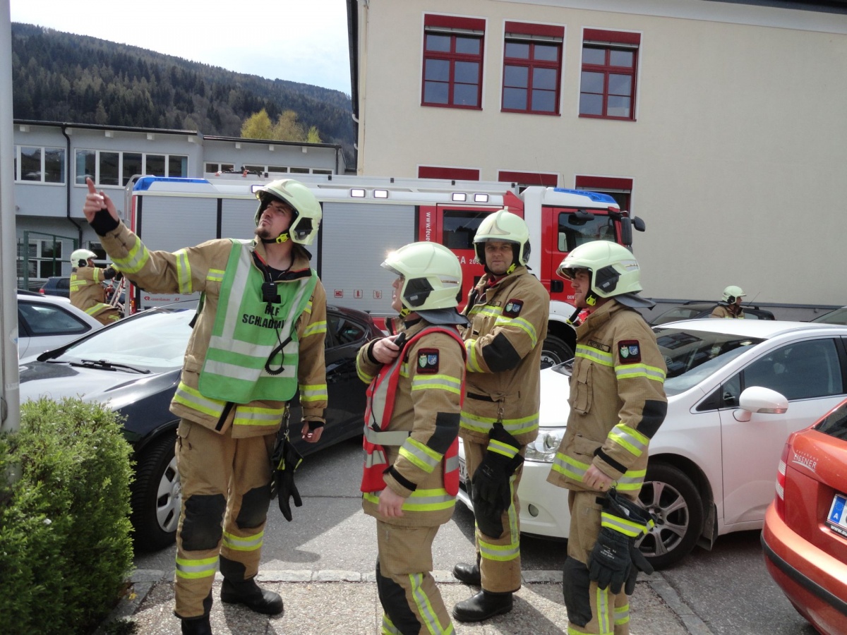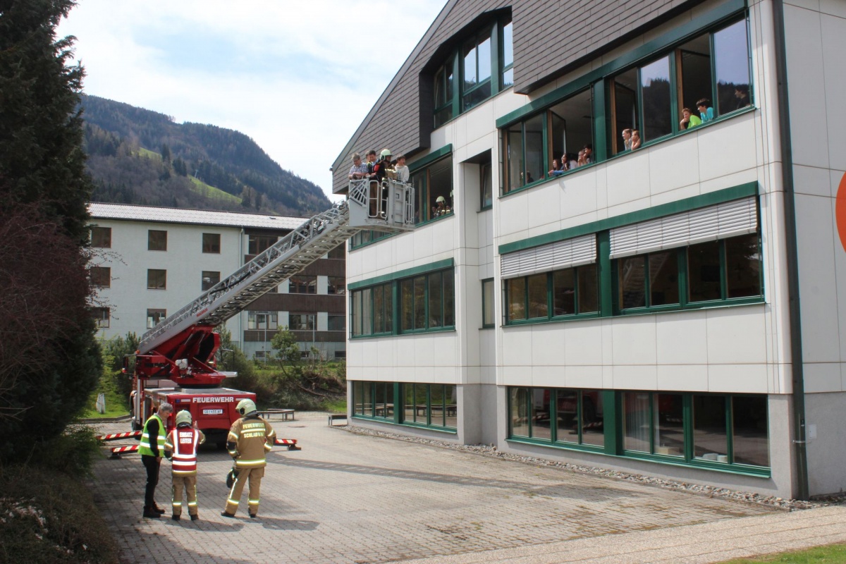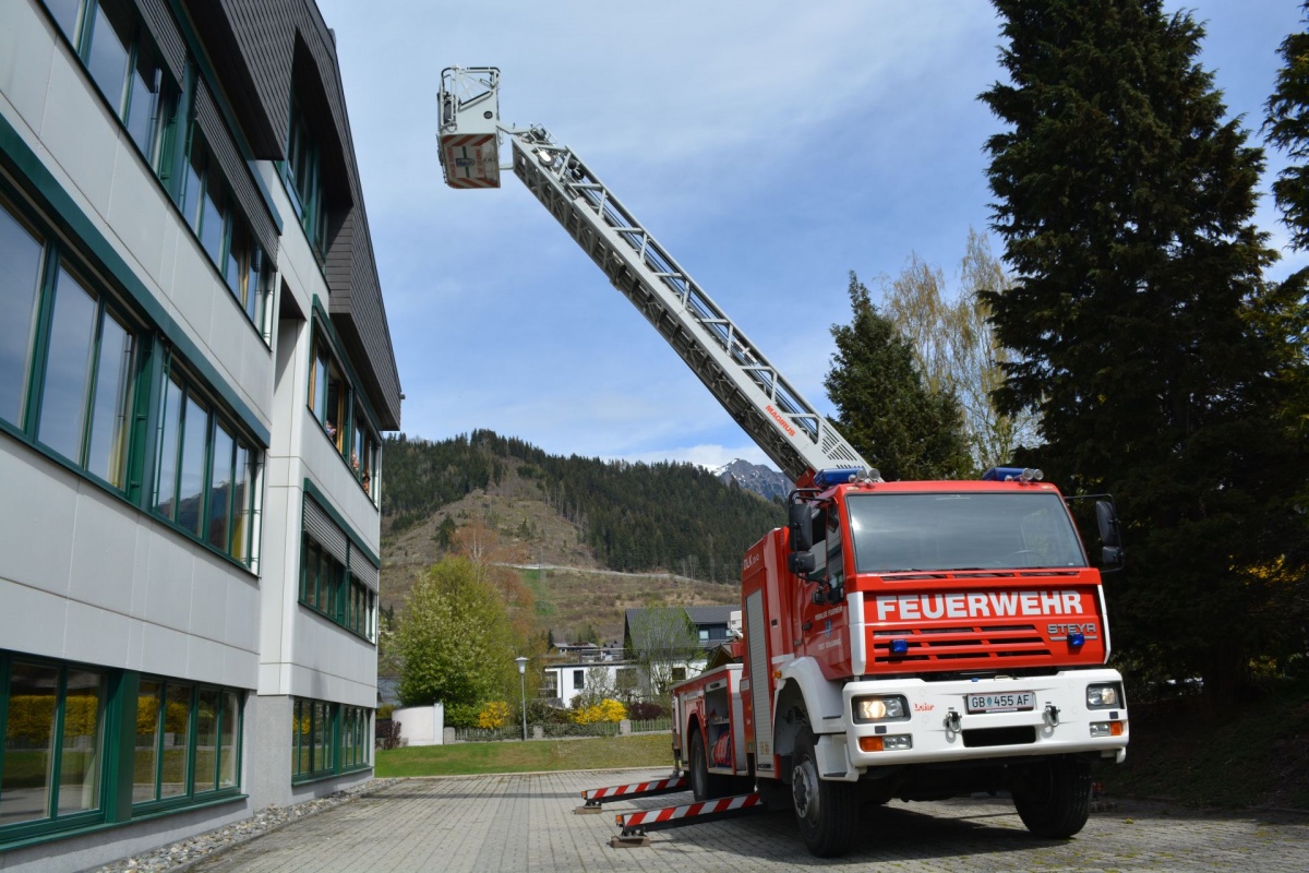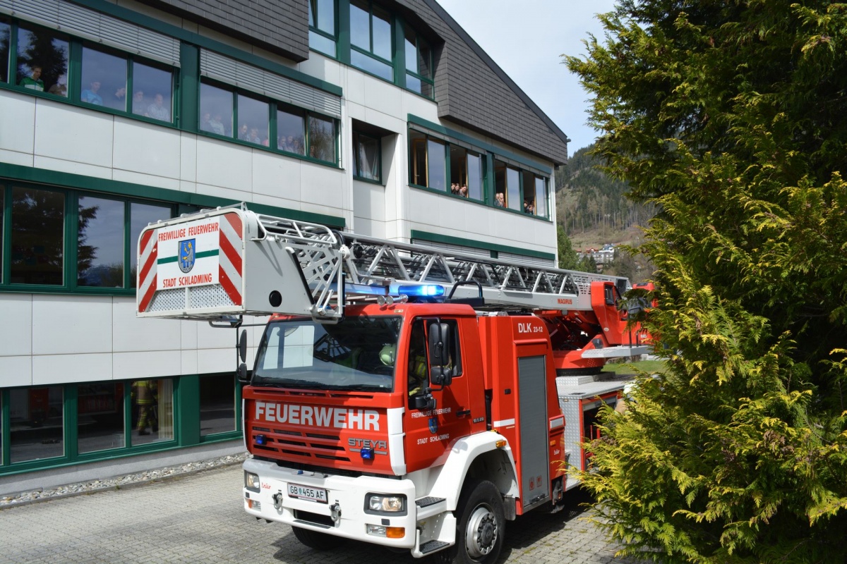Nach Vorgesprächen mit dem Brandschutzbeauftragten Walcher Hans, der FF Schladming (Kommandant HBI Sieder Roman, Zugskommandant BM Barthelme Toni jun.) und der Schule war es um 11.30 Uhr soweit.