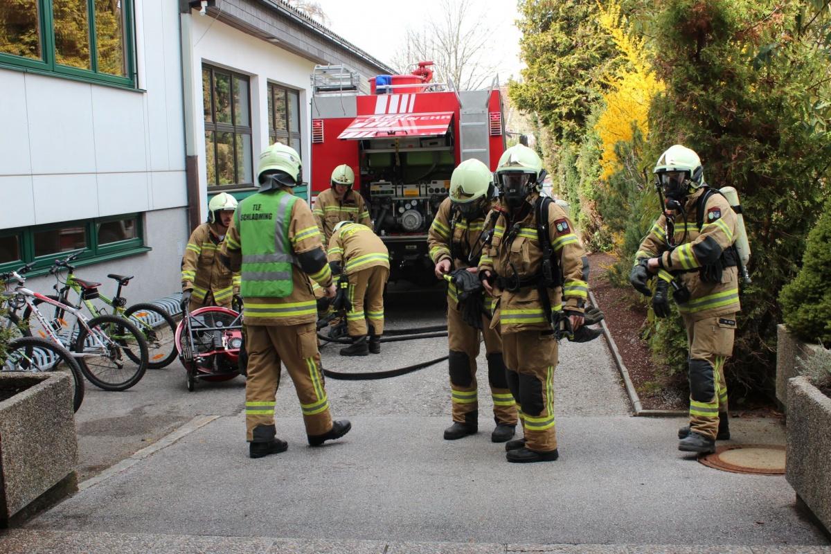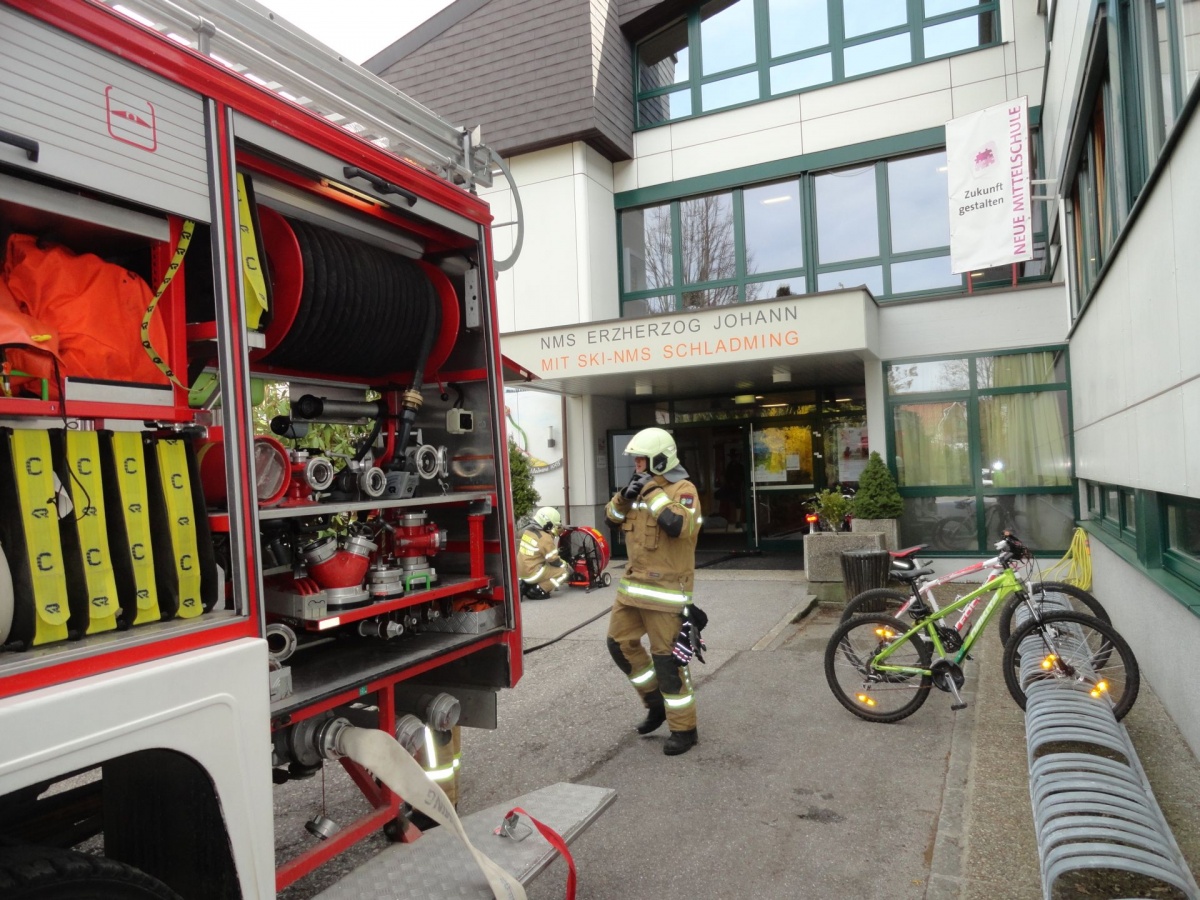 Nach dem Verrauchen der Ebene Physiksaal wurde der Alarm für die Evakuierung des Gebäudes ausgelöst, gleichzeitig wurde auch die FF Schladming alarmiert.