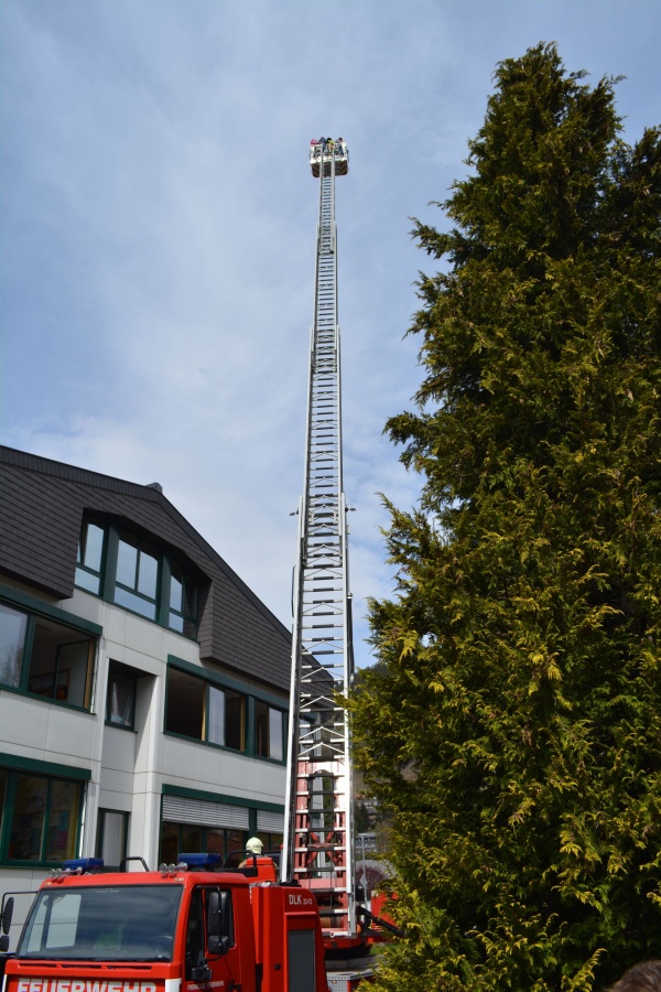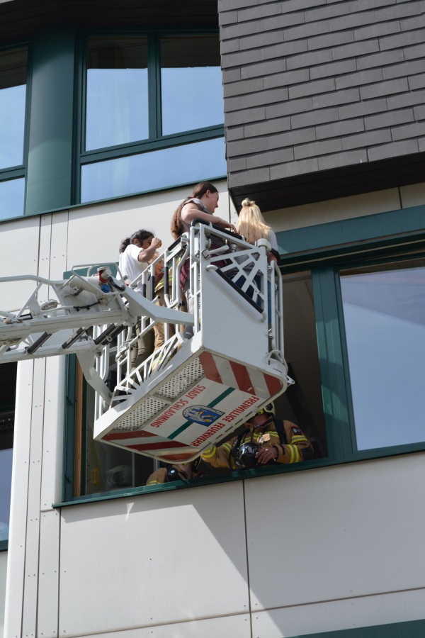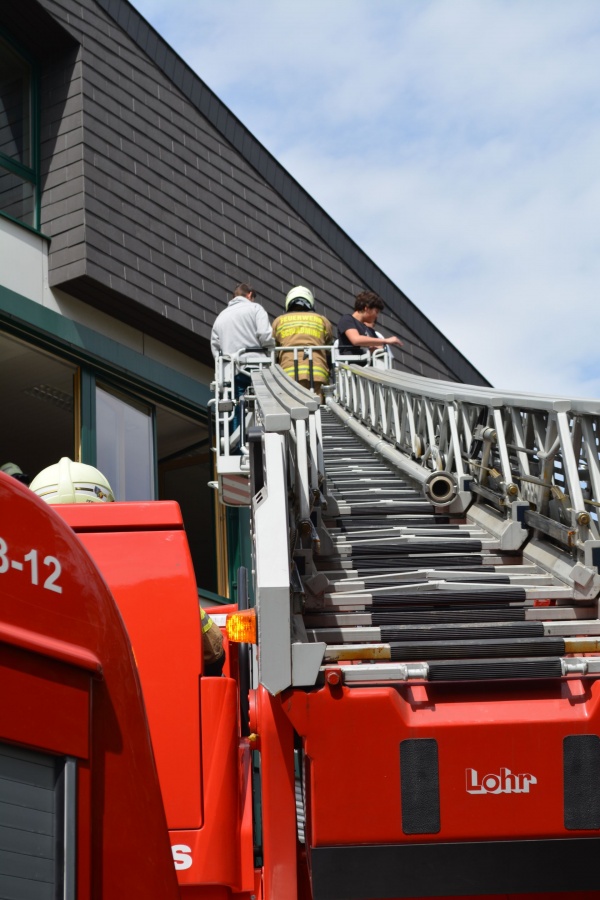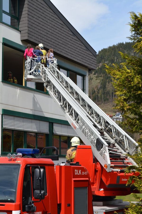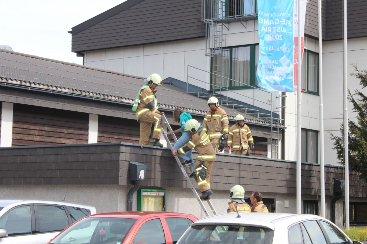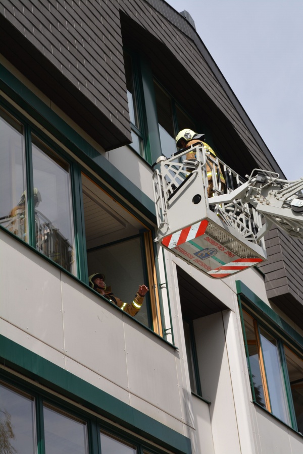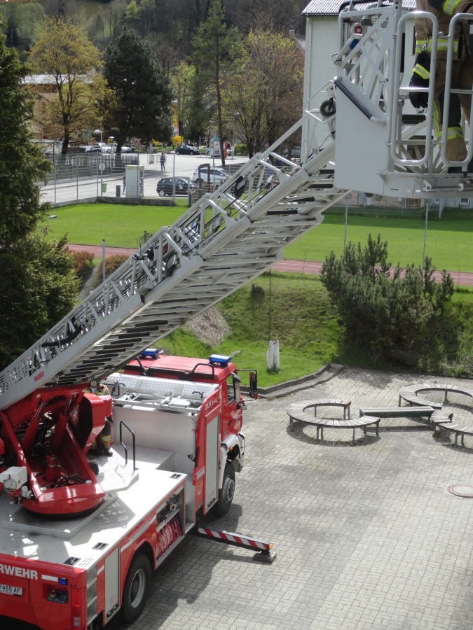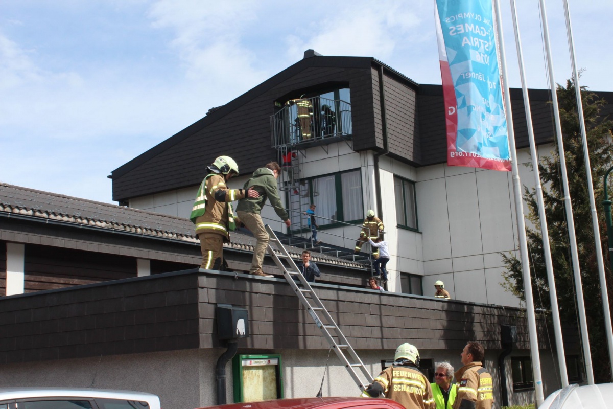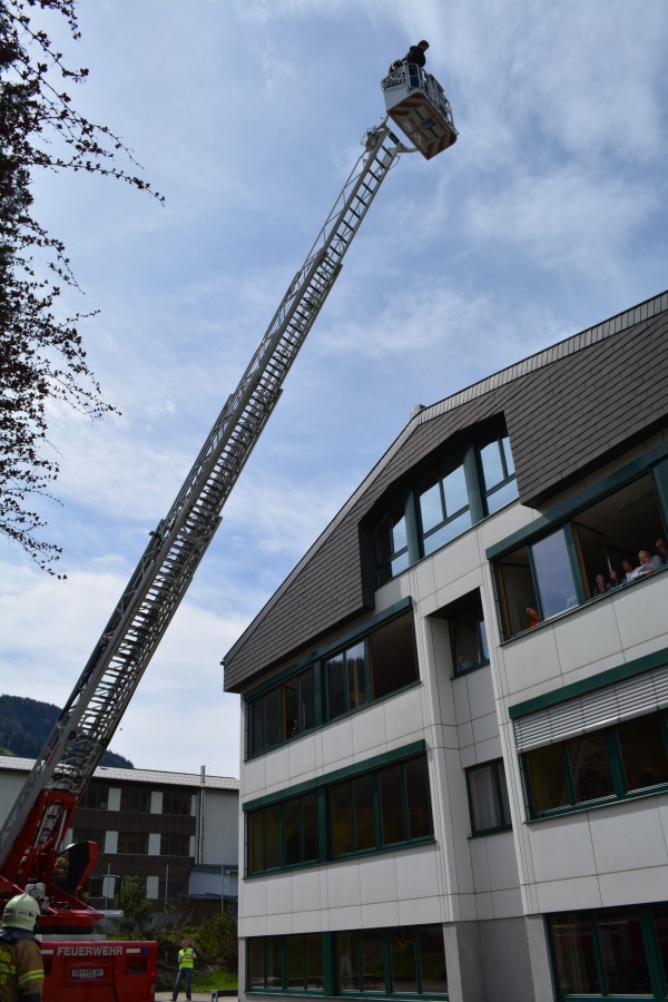 Staunend konnte man dabei der Evakuierung von zwei Klassen mittels Drehleiter zuschauen, auf der anderen Seite des Gebäudes wurden alle SchülerInnen der Ski-NMS, welche in den beiden obersten Etagen vom Rauch eingeschlossen wurden, über die vorhanden Feuerleiter von der Feuerwehr bis zum sicheren Boden begleitet.