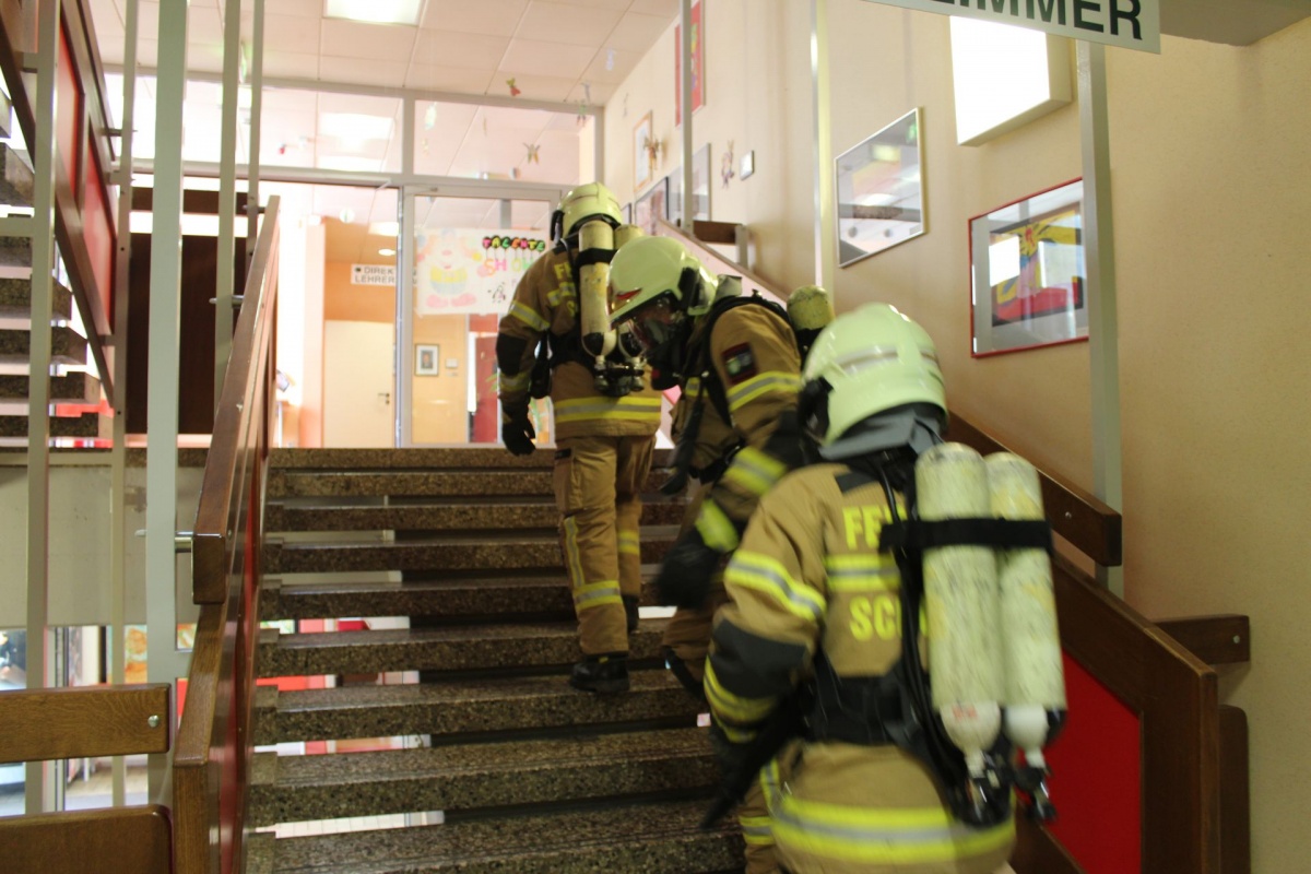 Die SchülerInnen und LehreInnen verließen geordnet über den Fluchtweg das Gebäude und versammelten sich auf dem vorgesehenen Fluchtplatz. Kurz danach traf die Feuerwehr mit drei Fahrzeugen ein, um einerseits den möglichen Brandherd zu bekämpfen und um andererseits eingeschlossenen SchülerInnen mit ihren LehrerInnen zu bergen.