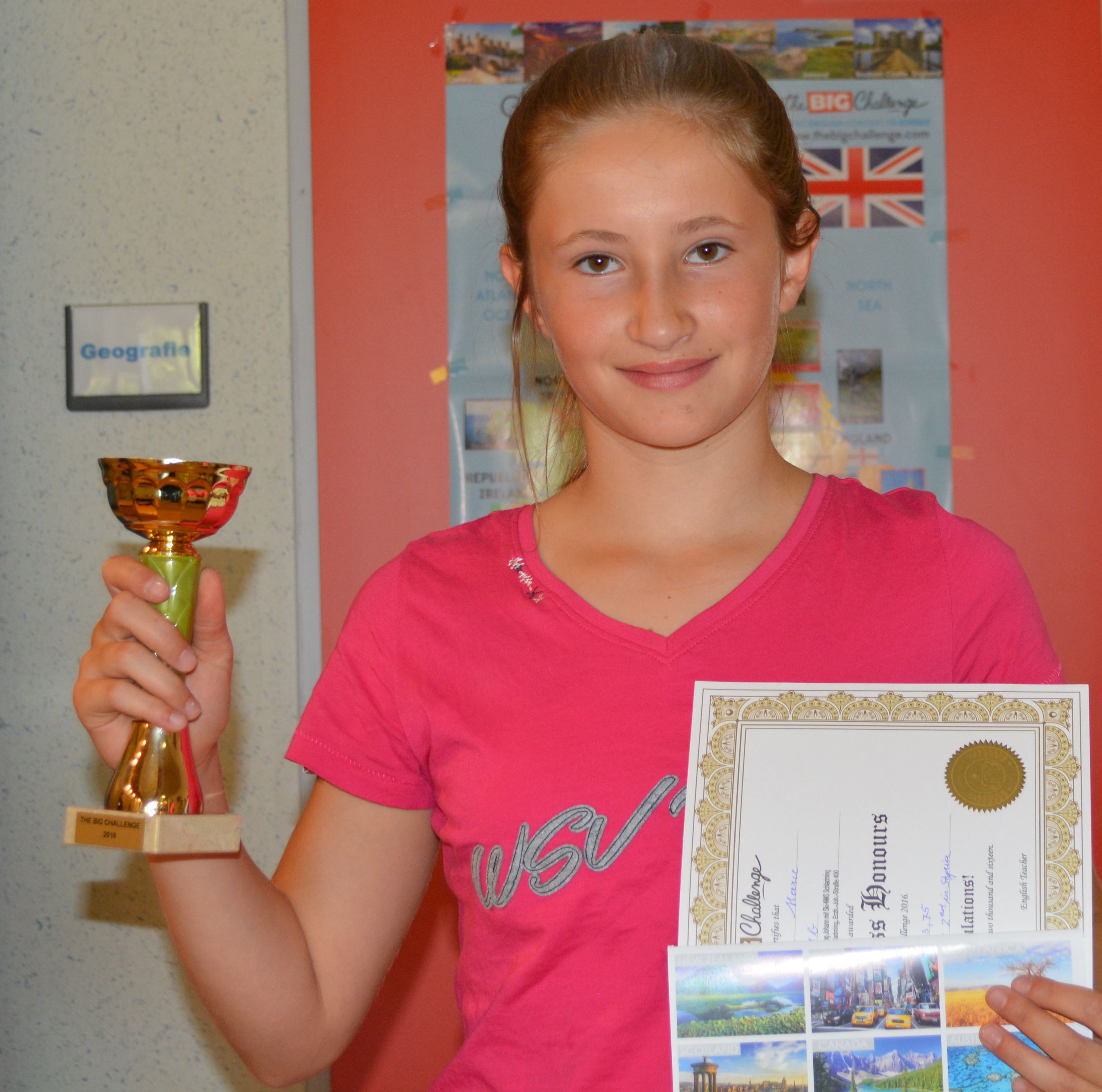 Wir gratulieren Marie Tritscher zum 2. Platz auf Länderebene für die 1.Klasse. Sie erhielt dafür das First Class Honours-Diplom. Weitere beachtliche Ränge gab es für Lyons Georgia aus der 2a-Klasse (4. Platz) , Lyons Gloria aus der 4a-Klasse (10. Platz) und Maximilian Zorn aus der 4s-Klasse (13. Platz).