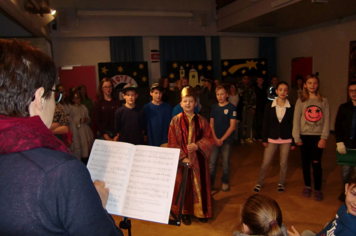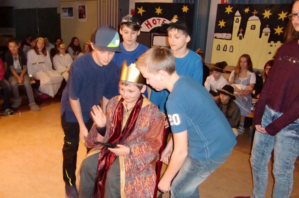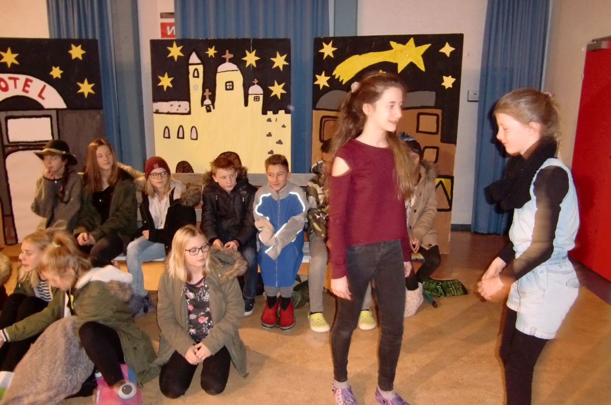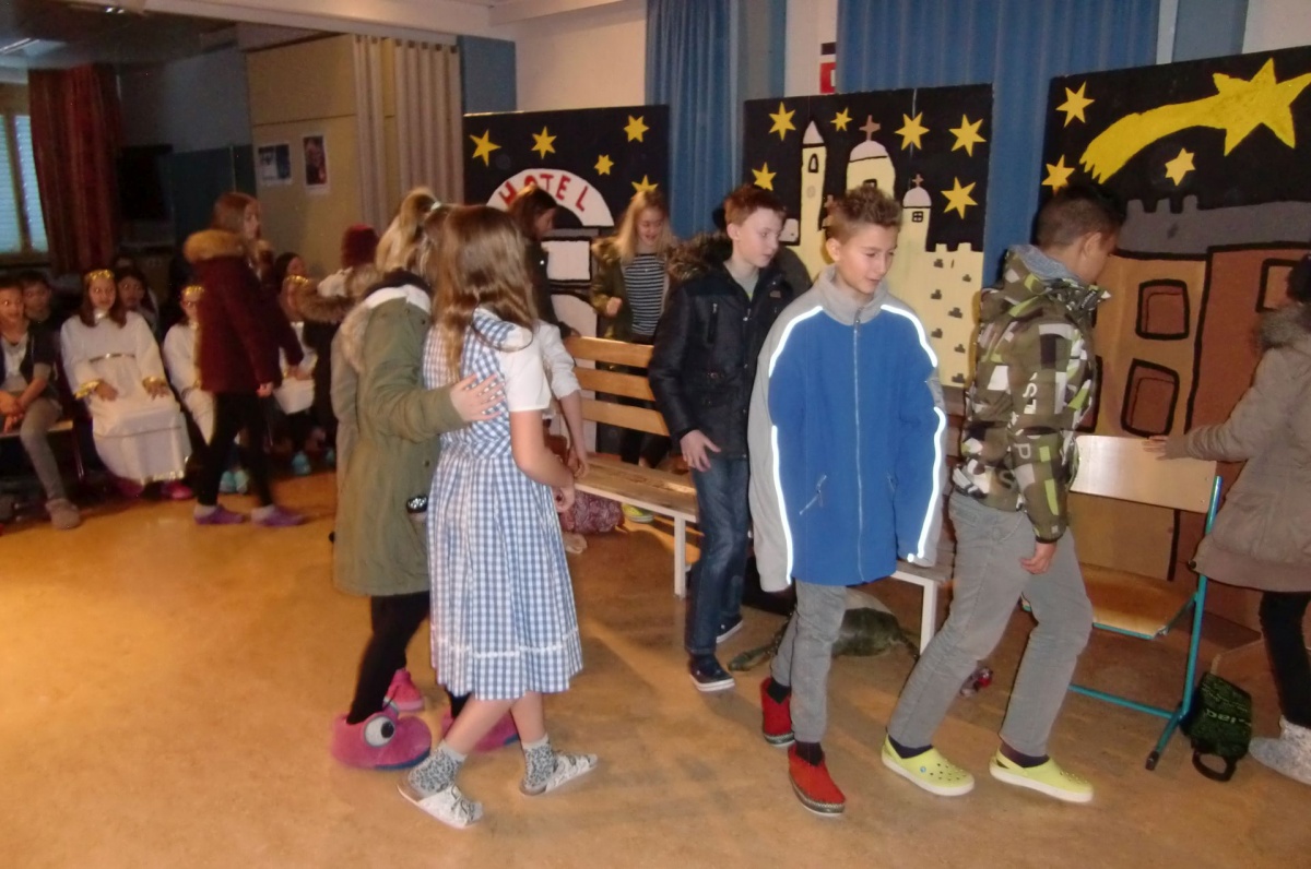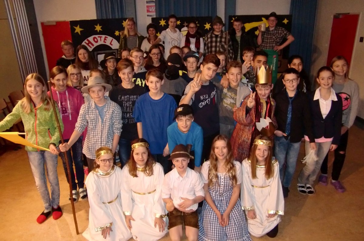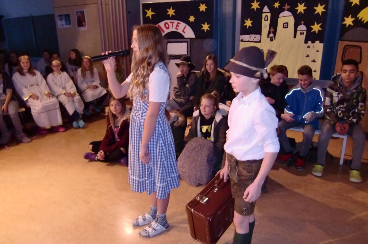 Die Schülerinnen und Schüler der 2a, 3a und 3b Klassen studierten im Rahmen des Deutsch- und Musikunterrichtes ein Musical zur Weihnachtsgeschichte ein. Die bekannten historischen Inhalte der Herbergssuche wurden dabei gekonnt in die Neuzeit transferiert,