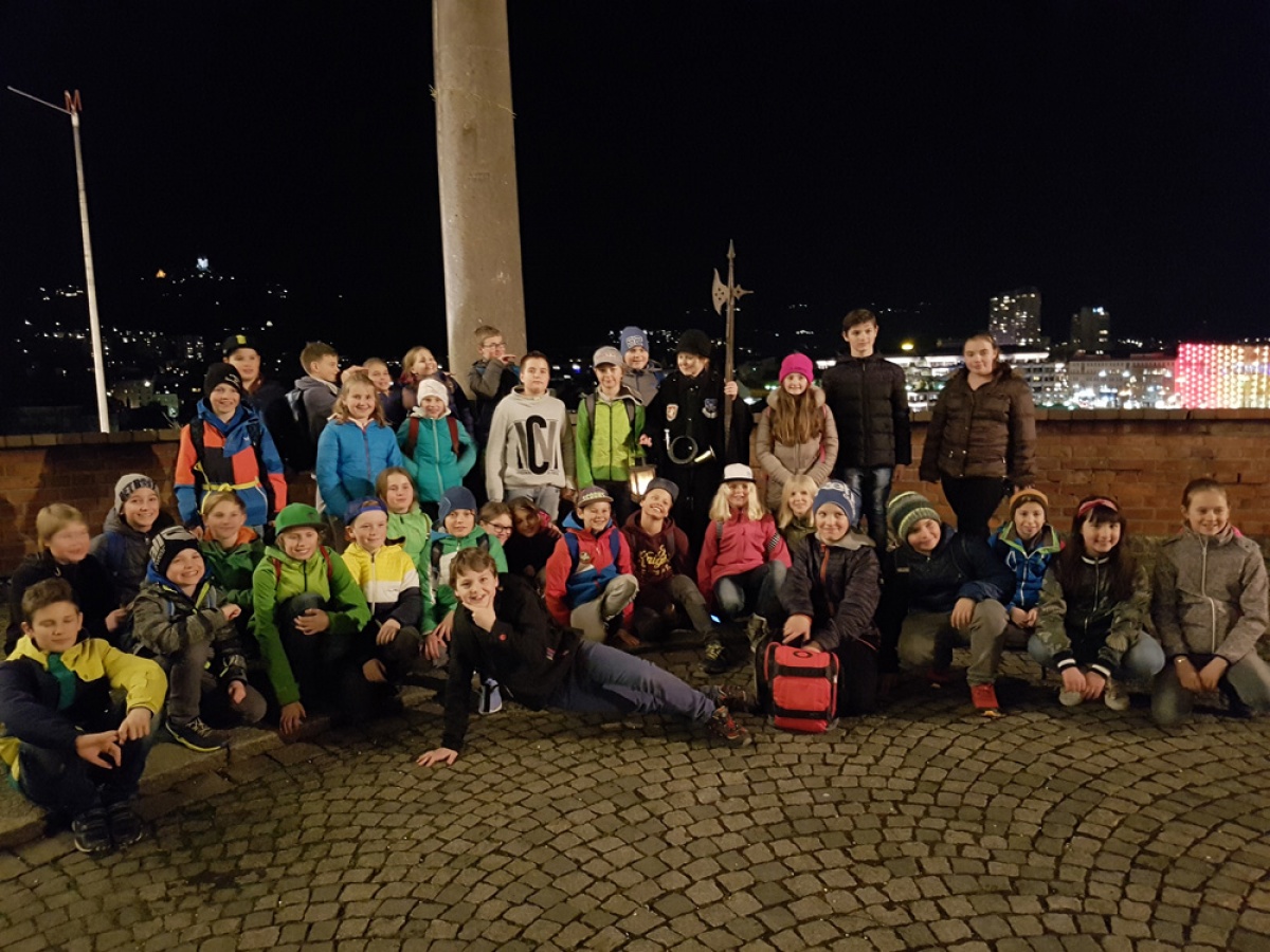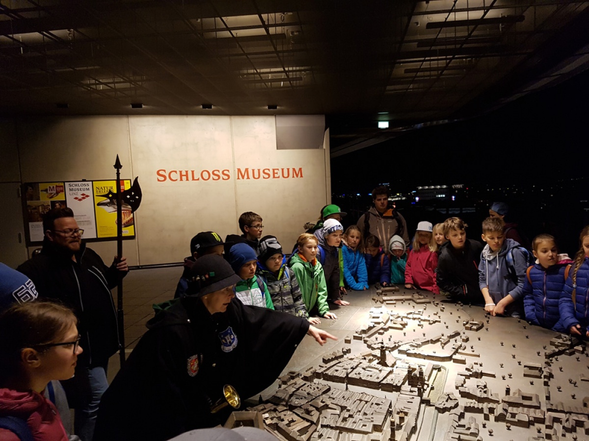 Nach dem Bezug der Jugendherberge ging es zu Fuß zur Stadtbesichtigung. Dabei wurden die Innenstadt, der Mariendom und der Rathausplatz sowie die Landstraße eingehend erkundet. Der erste Zwischenstopp wurde mittags beim „Leberkas-Pepi“ eingelegt, wo sich jeder eingehend stärkte. Vorbei an der alten k.u.k. Hofbäckerei ging es durch den Volksgarten zum neuen Musiktheater. Dort fand eine interessante Fundus-Führung statt, die viele Einblicke hinter die Kulissen des Theaters gewährte. Schließlich ging es mit der Pöstlingbergbahn auf den Pöstlingberg, um den Blick über die Dächer von Linz zu genießen. Abends folgte noch eine Nachtwächtertour hinauf zum Schlossmuseum und durch die alten Gassen von Linz. Nach diesem umfangreichen Tagesprogramm fielen schließlich (fast) alle erschöpft in ihre Betten.