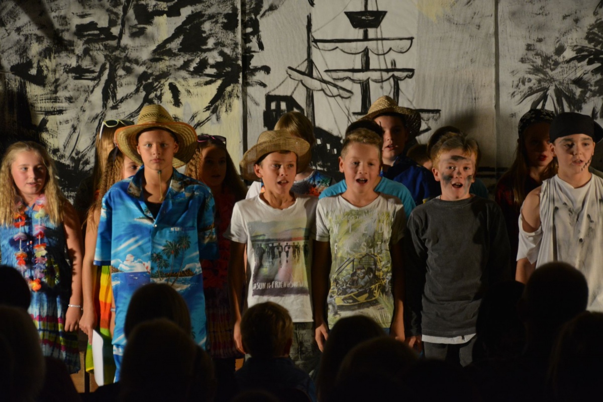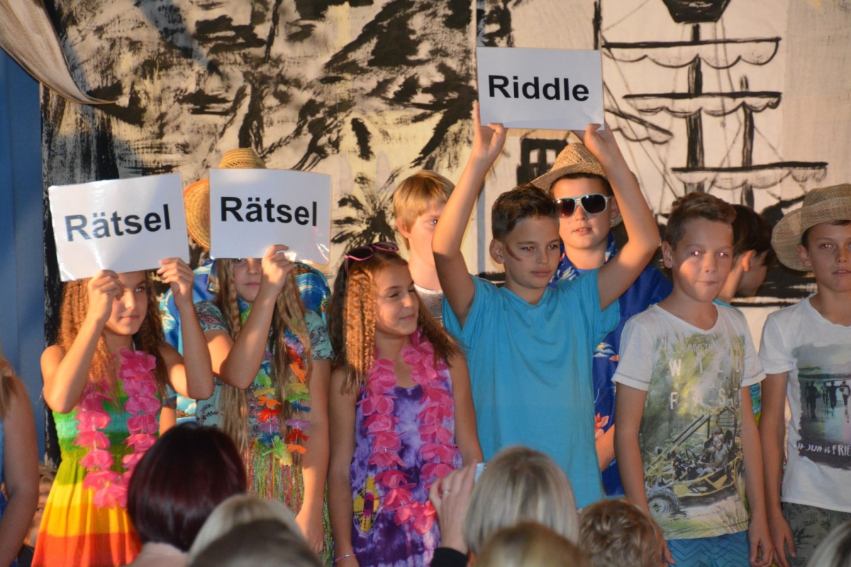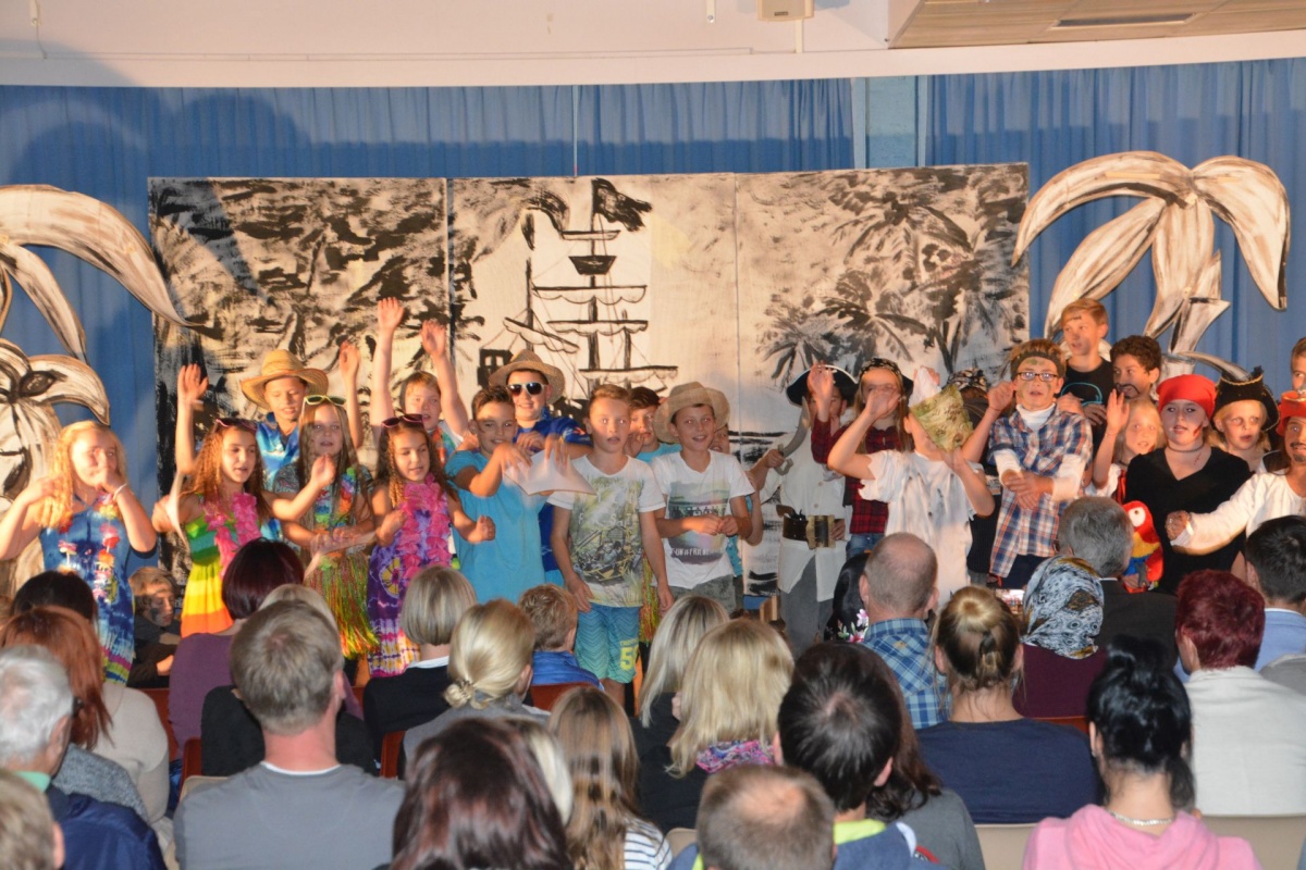 Während die Texte auf Deutsch gesprochen wurden, sangen unsere begeisterten Piraten sämtliche Lieder auf Englisch und mussten auf ihrer Reise durch die Südsee einige schwierige Aufgaben lösen. Erst das Aufeinandertreffen mit den Inselbewohnern und das Bezwingen von sprechenden Steinen brachten sie zu ihrem lange ersehnten Ziel, nämlich einen großen Schatz zu finden. Im Rahmen ihres Abenteuers machten die kleinen Piratinnen und Piraten so manch eigenartige Erfahrung, sie durften fremde Kulturen kennenlernen, mussten ihre Ängste bezwingen und bemerkten am Ende, dass Freundschaft und Spaß oft mehr wert sind als irgendein Schatz. Die Zuseherinnen und Zuseher waren begeistert von lustigen Liedern, einstudiert mit Frau Maurer und Herrn Ranacher, tollen Texten, übersetzt und geprobt mit Herrn Wurzbach, lustigen und ideenreichen Kostümen sowie einem großartigen Bühnenbild, das die Schülerinnen und Schüler gemeinsam mit Herrn Strimitzer mit viel Einsatz gebastelt hatten. Ein Theatererlebnis für Jung und Alt, das für Kurzweile sorgte und alle Gäste glücklich stimmte. Wir sind sehr stolz auf unsere großartigen Schülerinnen und Schüler und ihren unermüdlichen Einsatz für dieses einmalige Musicalprojekt.
