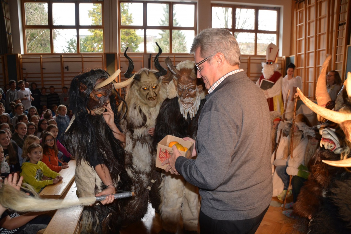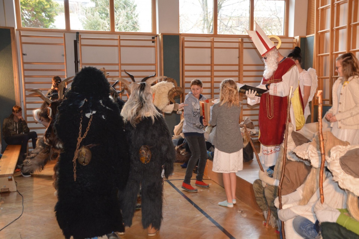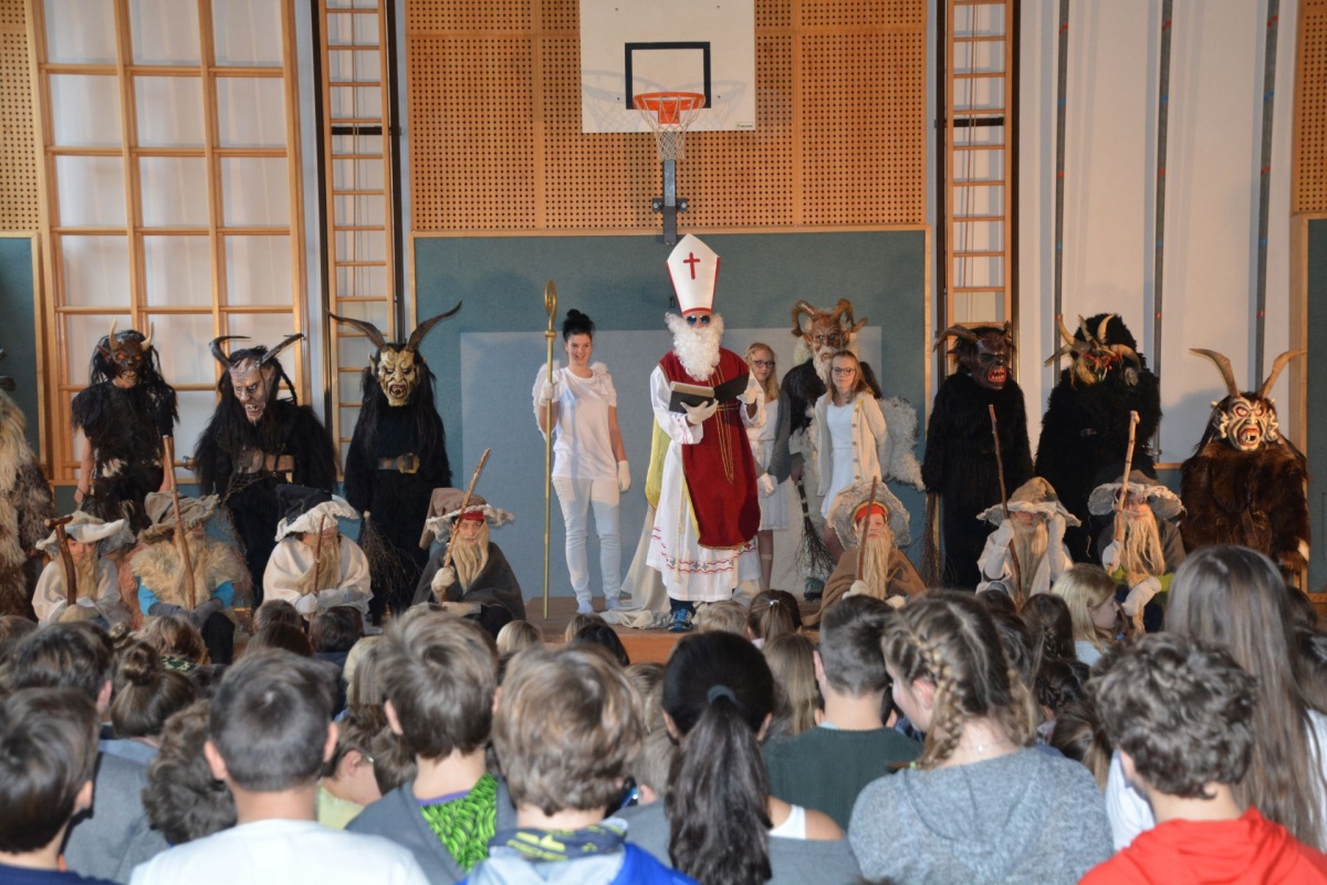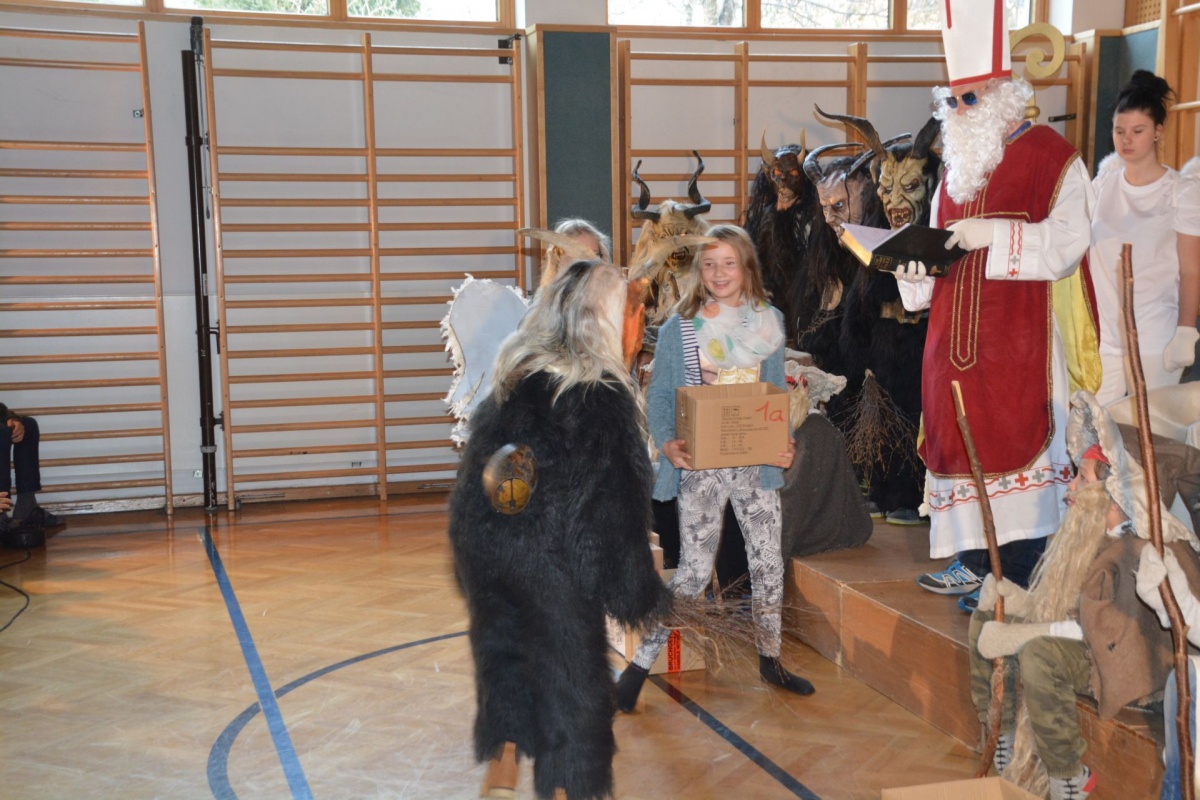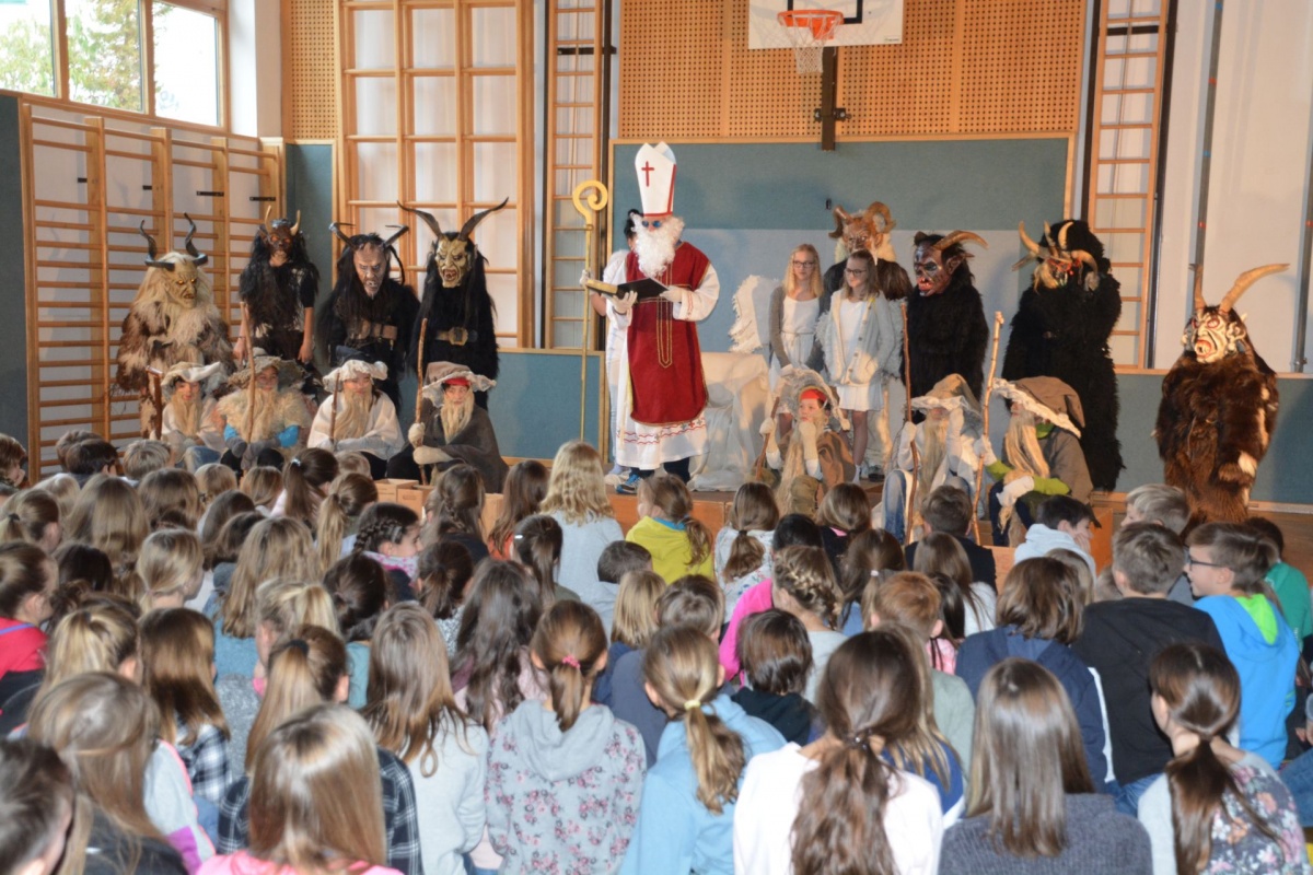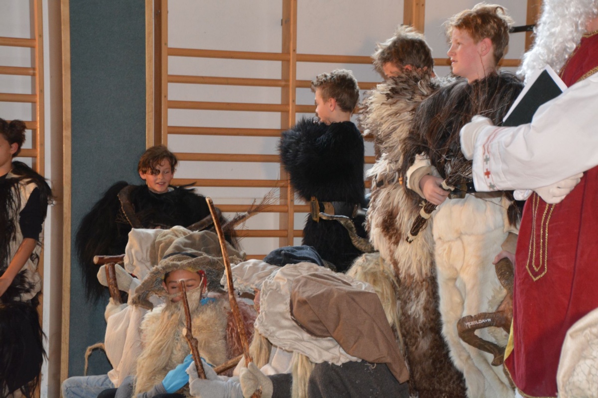 Gott sei Dank konnte der Nikolaus fast nur Gutes von den Klassen berichten, die Krampusse mussten daher nur bei wenigen Klassen etwas mehr mit der Rute „streicheln“. Als Geschenk bekamen alle Kinder unserer Schule und natürlich auch die 4a und 4b der VS Schladming mit ihren Lehrerinnen Mandarinen überreicht.