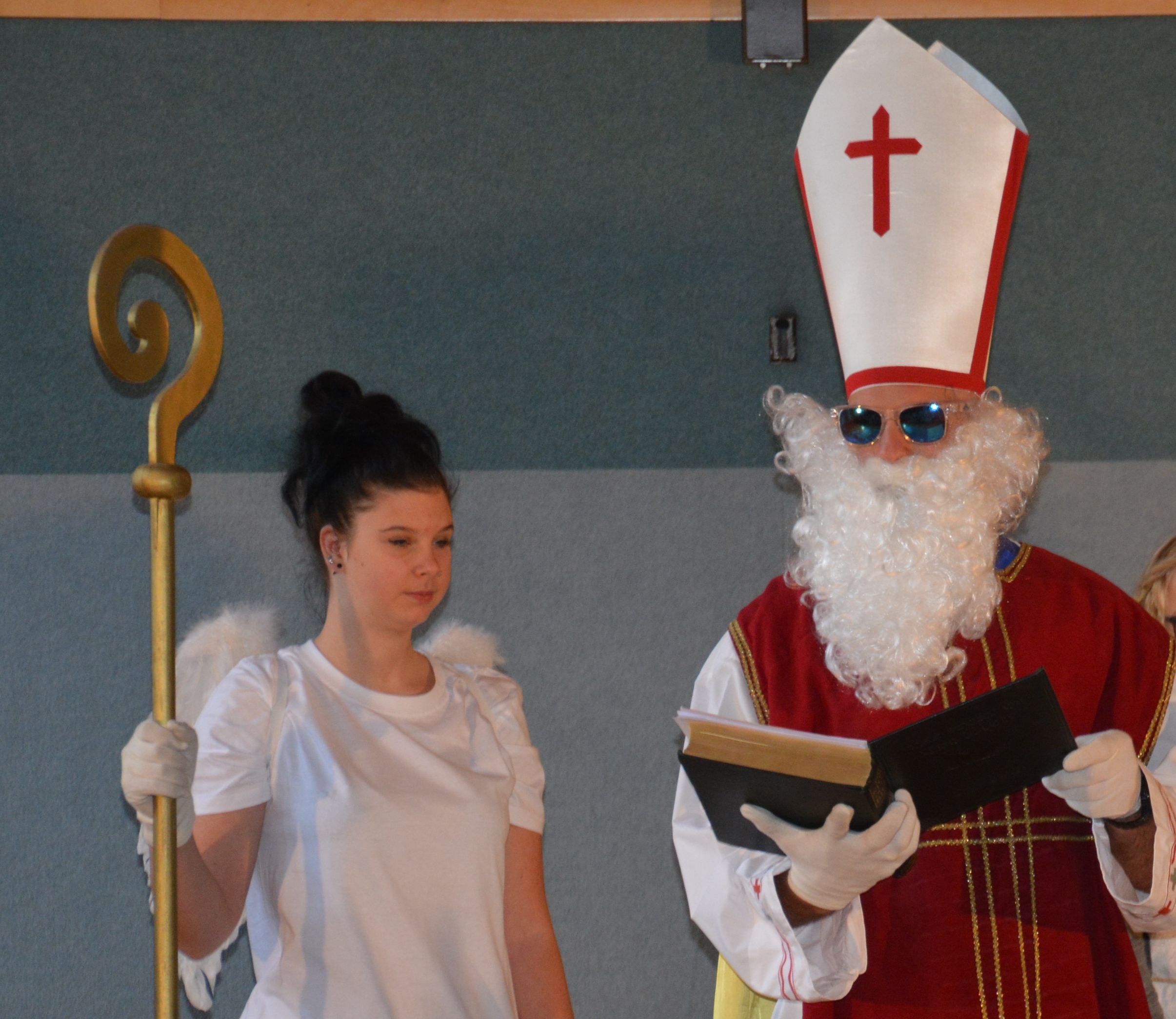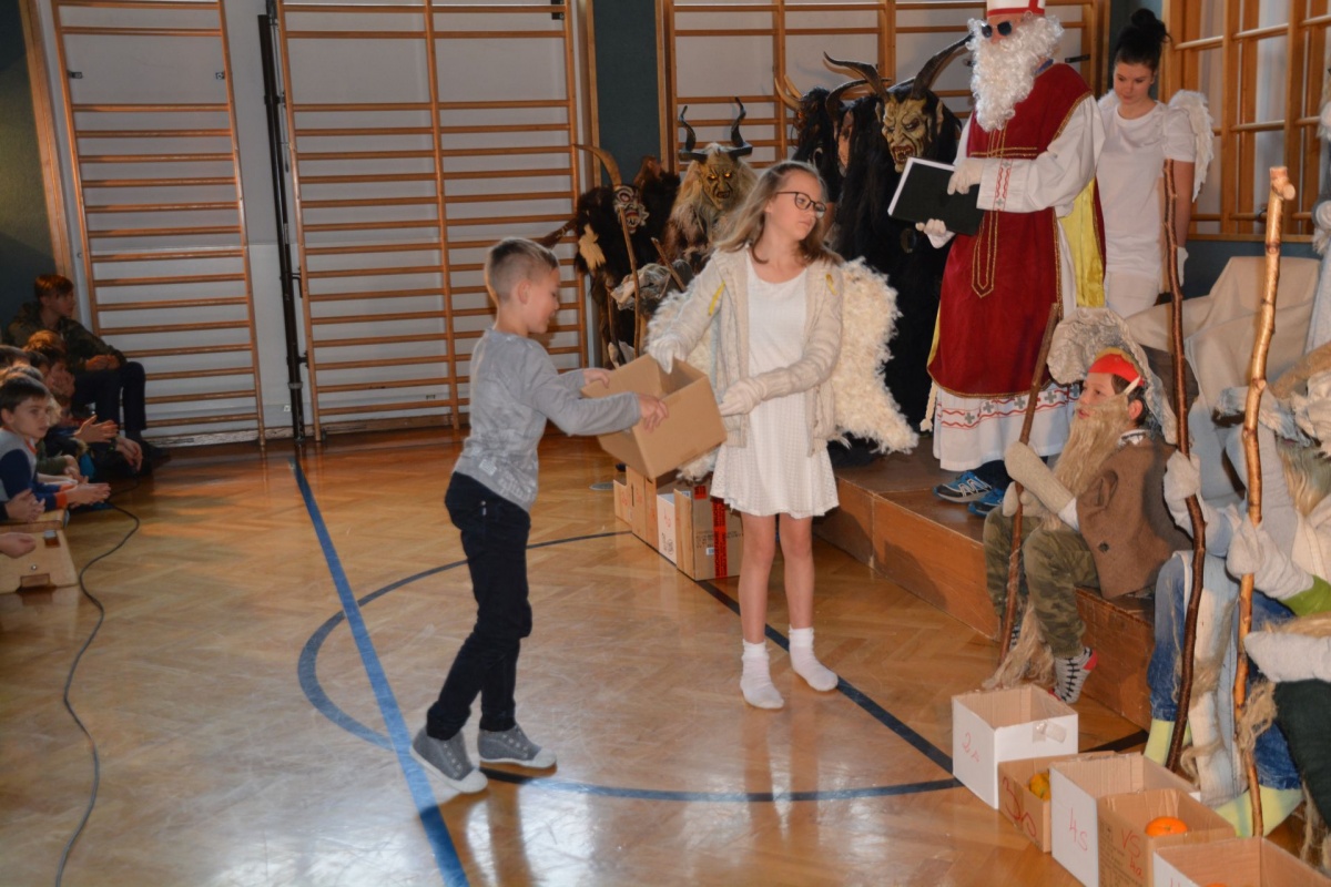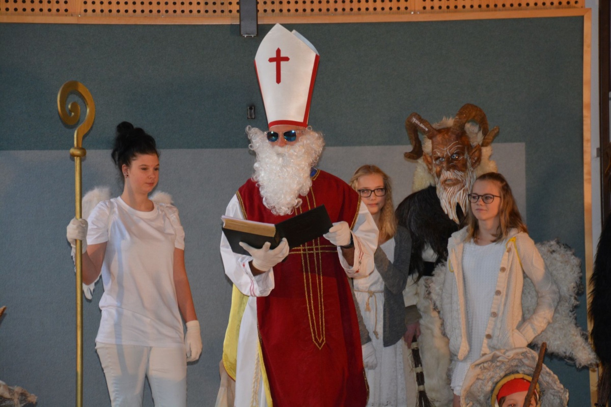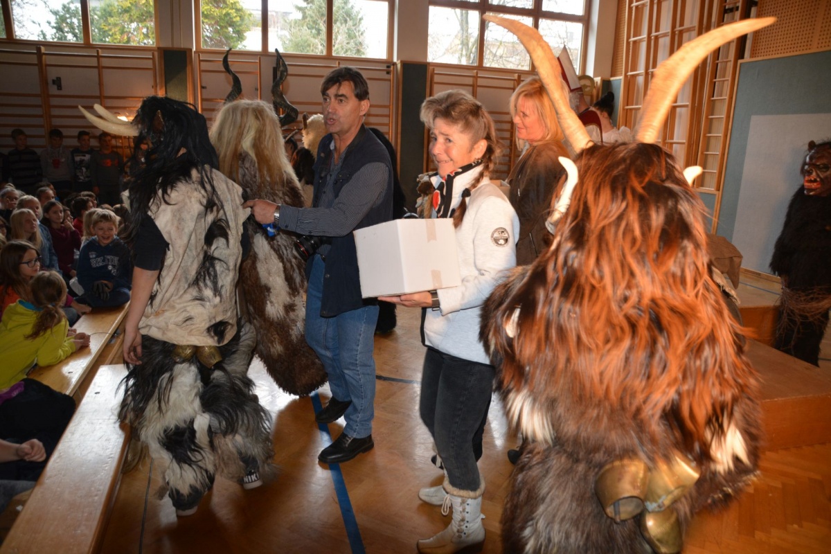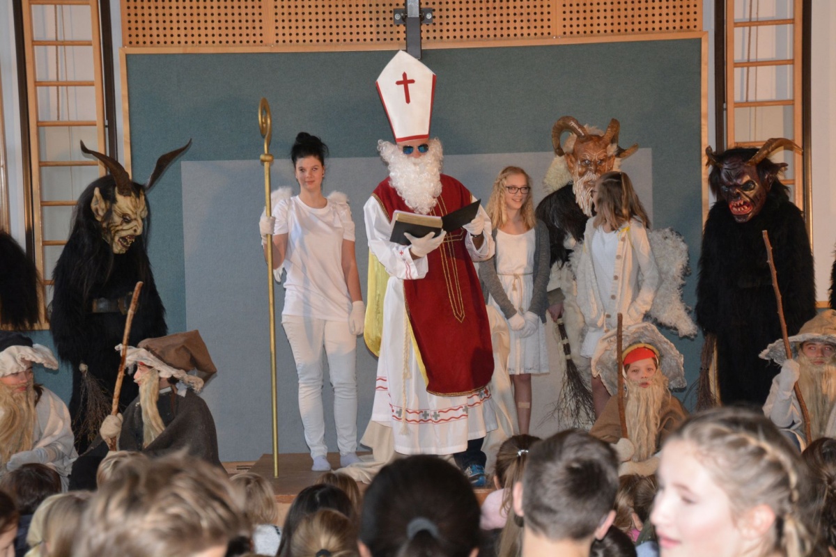 Gott sei Dank konnte der Nikolaus fast nur Gutes von den Klassen berichten, die Krampusse mussten daher nur bei wenigen Klassen etwas mehr mit der Rute „streicheln“. Als Geschenk bekamen alle Kinder unserer Schule und natürlich auch die 4a und 4b der VS Schladming mit ihren Lehrerinnen Mandarinen überreicht.
