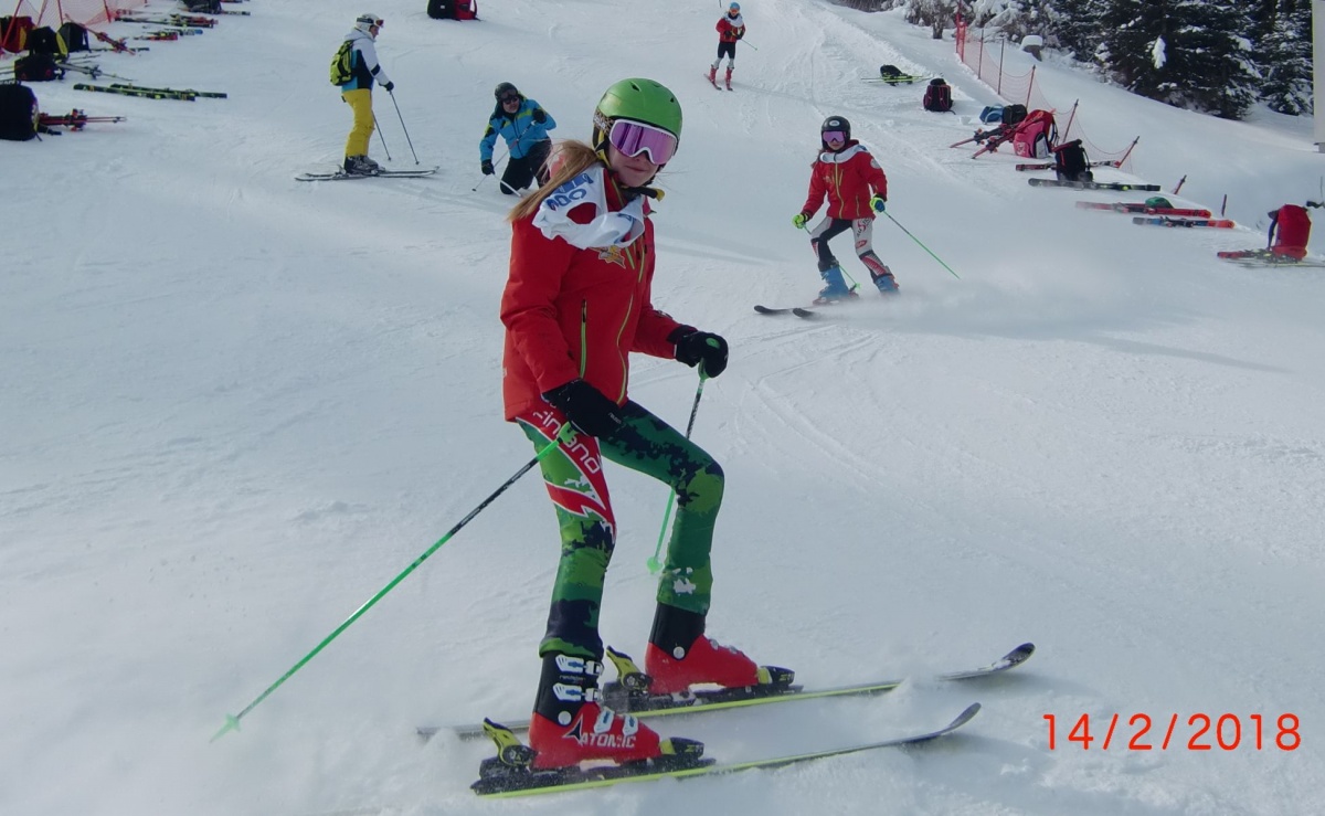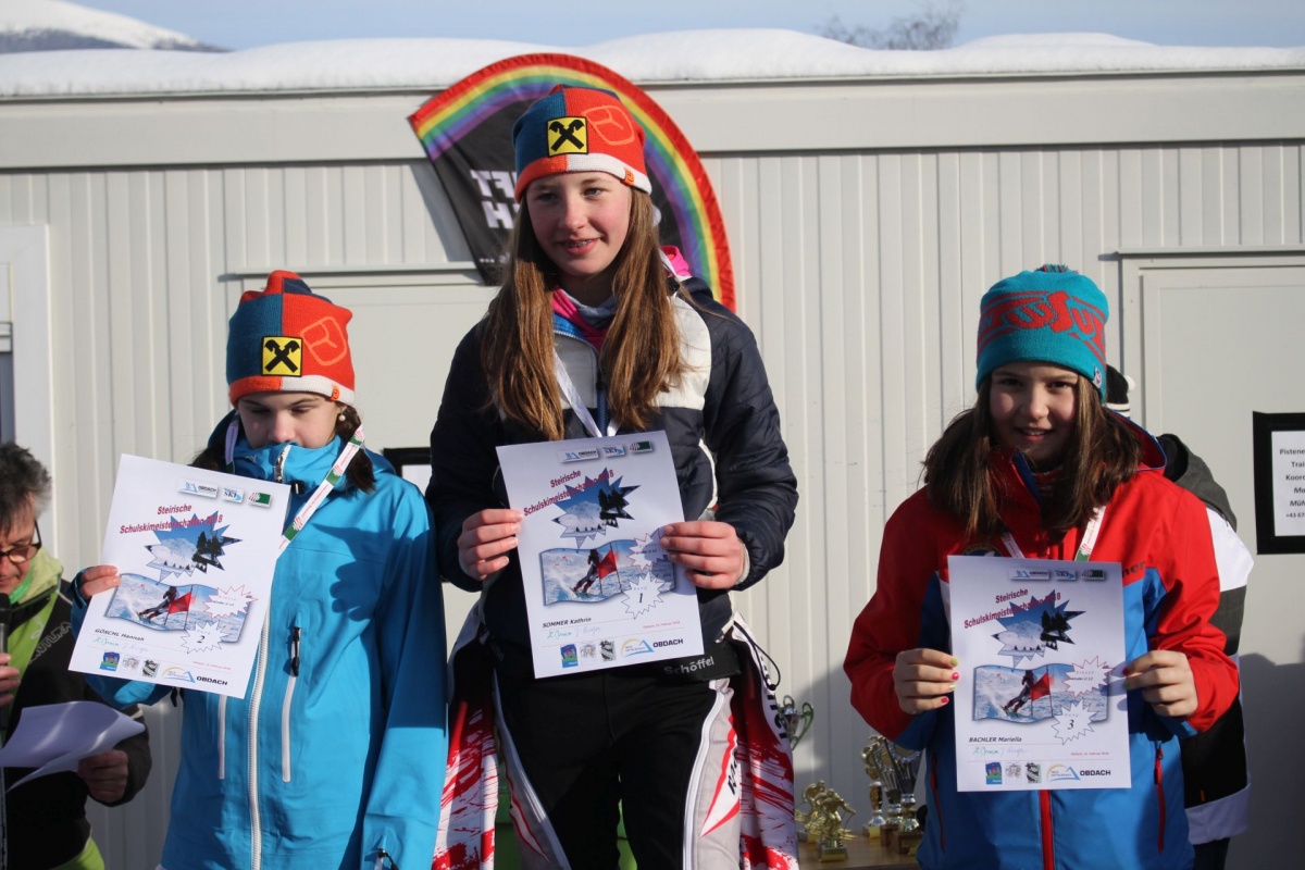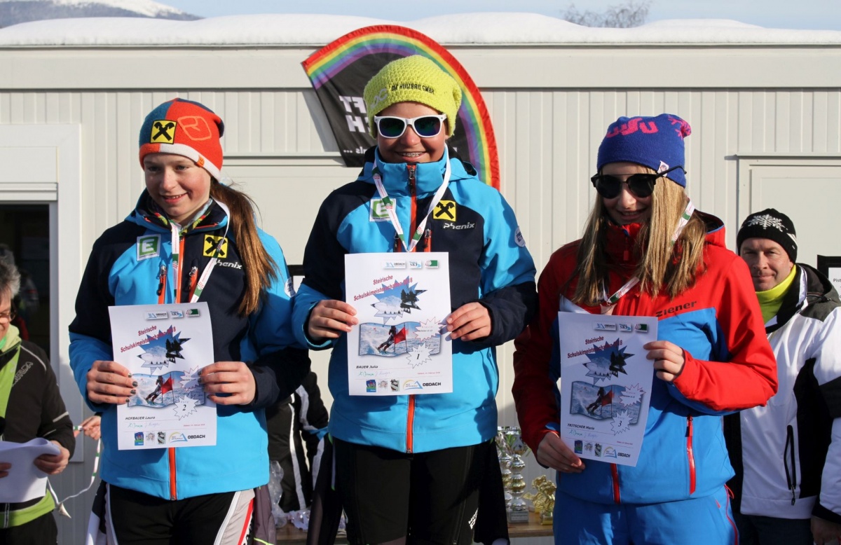 Ähnlich erfolgreich präsentierte sich unser „vierzehn Mann, bzw. Frau“ starkes Team auch bei der Landesmeisterschaft, die am Kalchberglift in Obdach am vorletzten Tag vor den Semesterferien stattfand. Bei herrlichem Skiwetter bewältigten diesmal Bachler Mariella und abermals Tritscher Marie als jeweils Dritte, sowie Giorgia Lyons als Zweite ihrer Altersklassen den drehend gesetzten Kurs am schnellsten. Die geballte Frauenpower dieser drei jungen Talente sicherte unserer NMS auch den zweiten Gesamtrang in der Gruppenwertung - herzliche Gratulation!