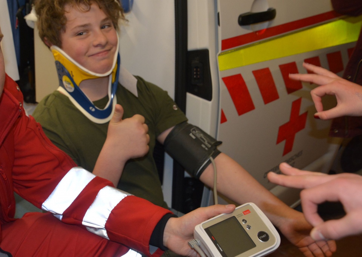Mit viel Interesse an den theoretischen Hintergründen und großem Einsatz bei den praktischen Übungen wurden im Rahmen einer Projektwoche alle elementaren Inhalte der Ersten Hilfe, wie das korrekte Absichern der Unfallstelle, das richtige Handeln beim akuten Notfallpatienten, die Durchführung von Basismaßnahmen und das Anlegen eines Druckverbandes zur Blutstillung, erlernt.