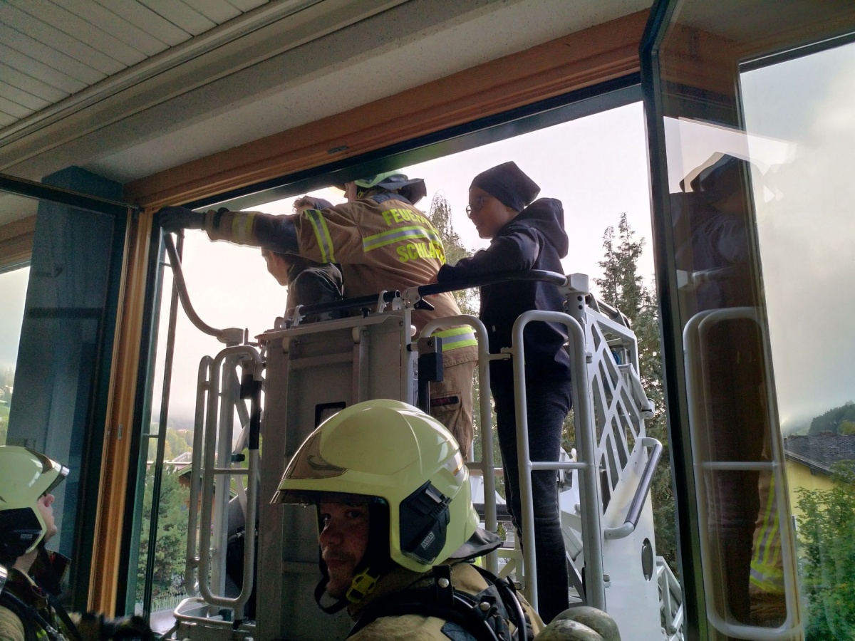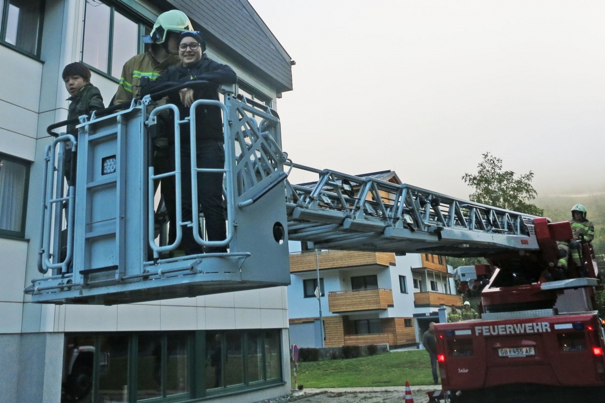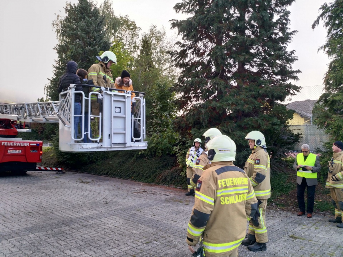 Alle Schülerinnen konnten sich geordnet laut Fluchtplan am Sammelplatz einfinden. Da die Kinder der 3b-Klasse das Gebäude nicht verlassen konnten, erfolgte eine Bergung mittels Drehleiter. Wohlbehalten konnte sich nach Übungsschluss alle wiederum in die Schule begeben. Die Übung hat bestens geklappt!