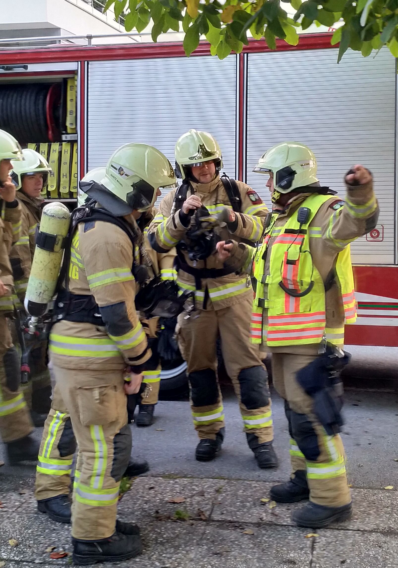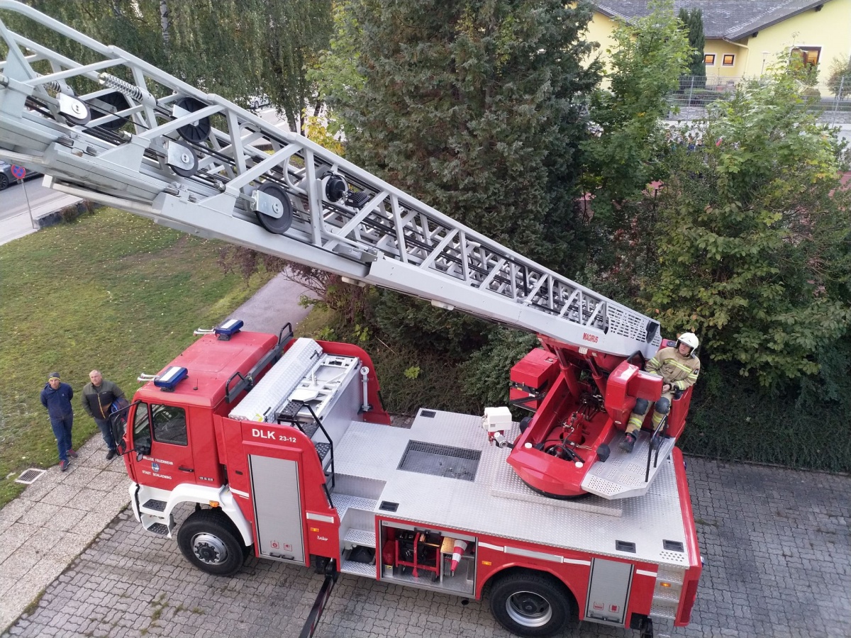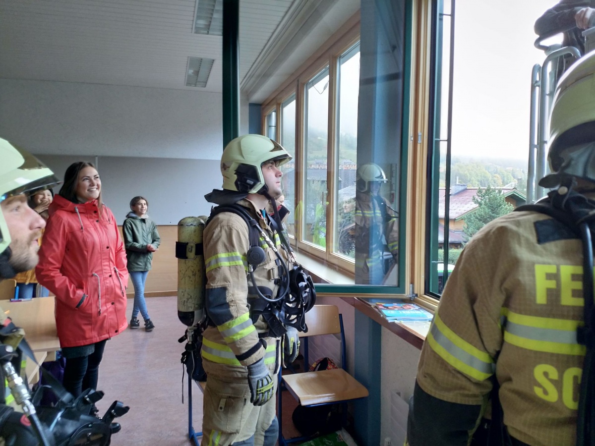 Alle Schülerinnen konnten sich geordnet laut Fluchtplan am Sammelplatz einfinden. Da die Kinder der 3b-Klasse das Gebäude nicht verlassen konnten, erfolgte eine Bergung mittels Drehleiter. Wohlbehalten konnte sich nach Übungsschluss alle wiederum in die Schule begeben. Die Übung hat bestens geklappt!
