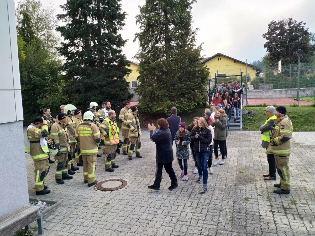 Nach erfolgtem Alarm und der Verständigung der Zentralstelle in Liezen durch den Direktor, erfolgte in vorbildlicher Weise die Räumung unseres Gebäudes durch die unsere LehrerInnen.
