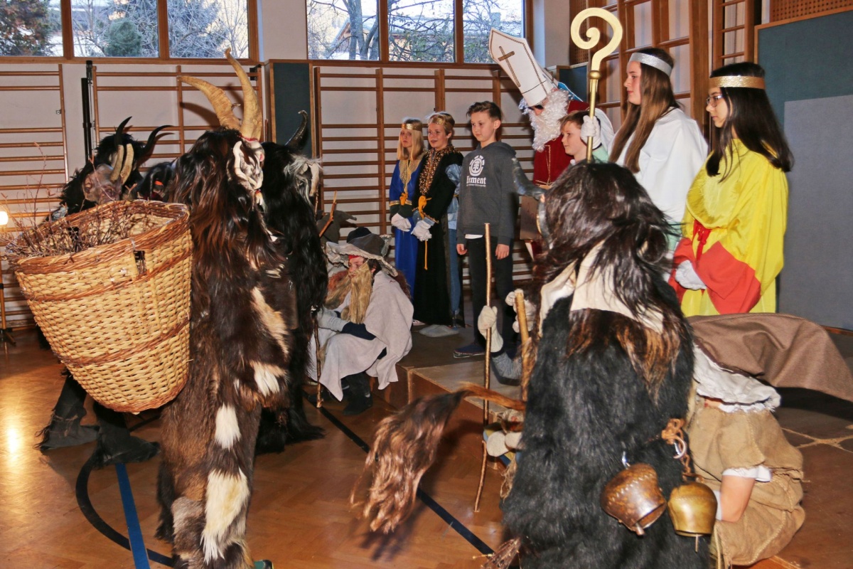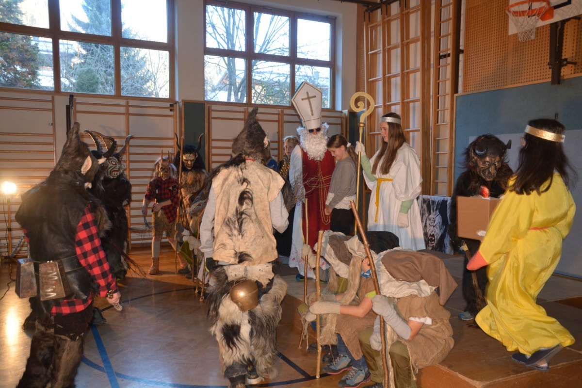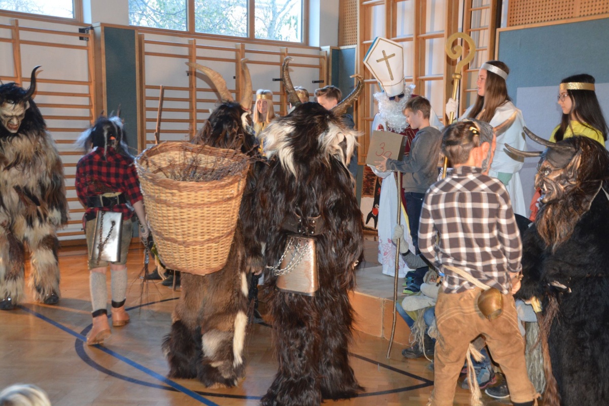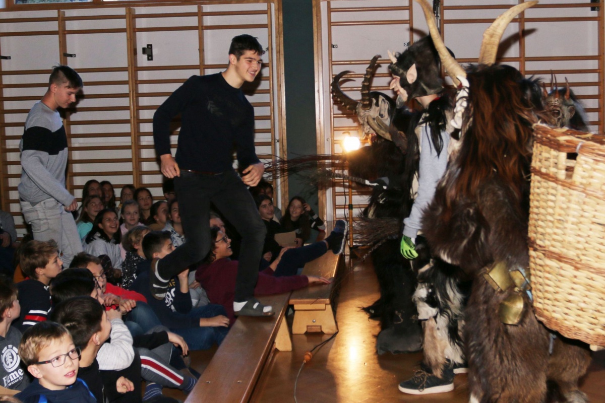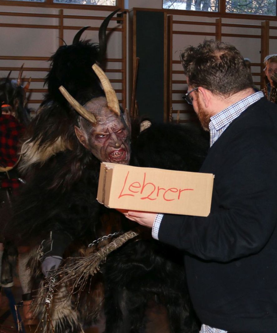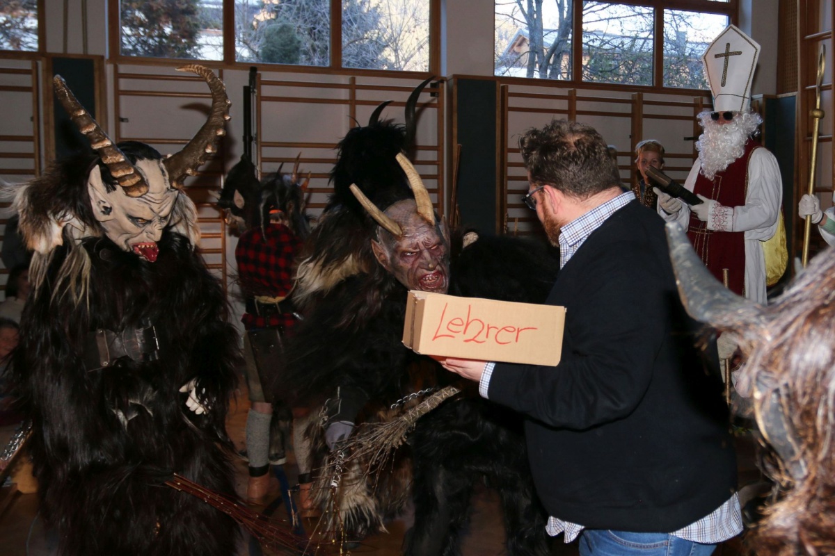 Auch die LehrerInnen bekamen etwas (ab), stellvertretend für sie "durfte" Leiterstellvertreter A. W., BEd MSc einige Streicheleinheiten der hauseigenen Krampusse über sich ergehen lassen.