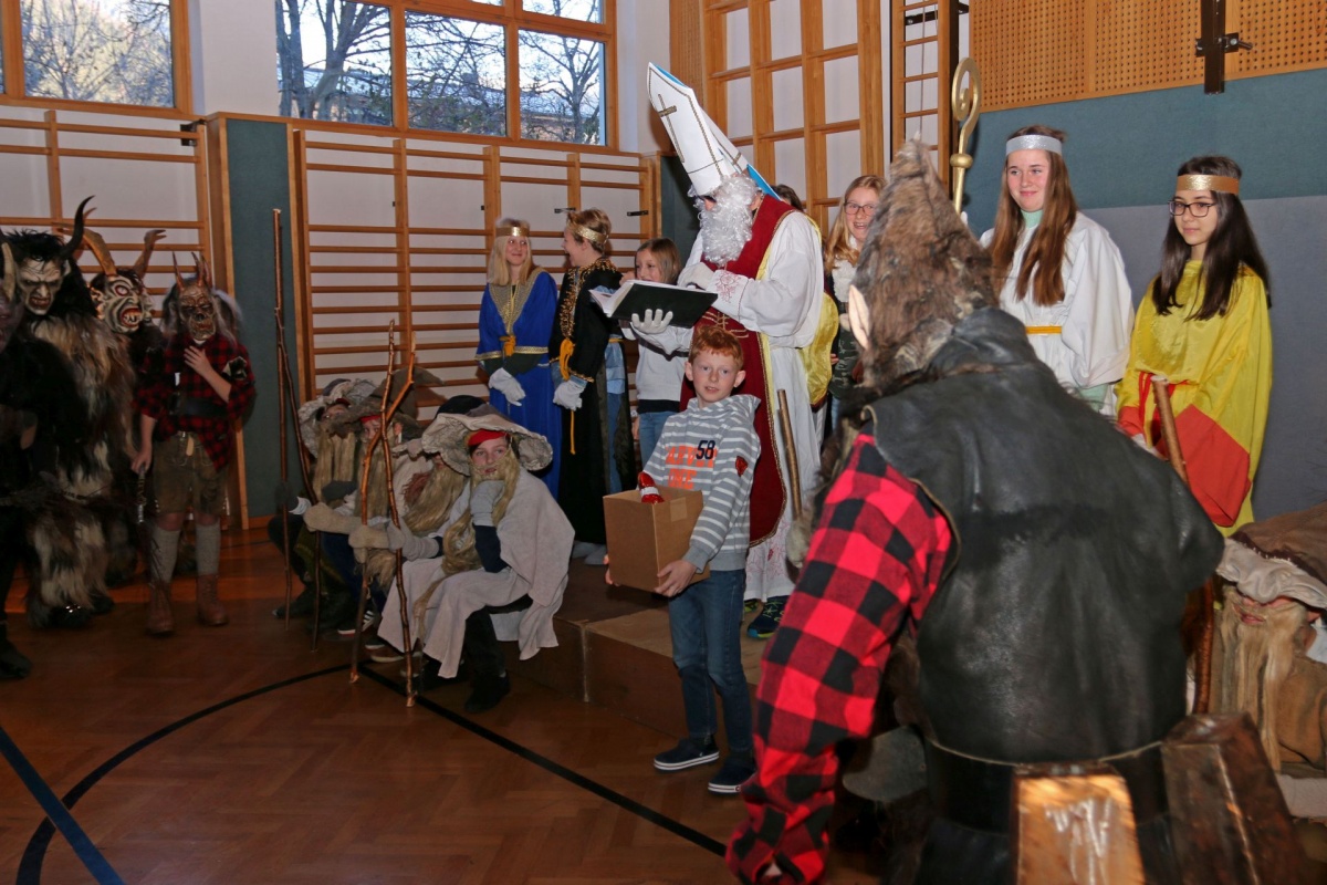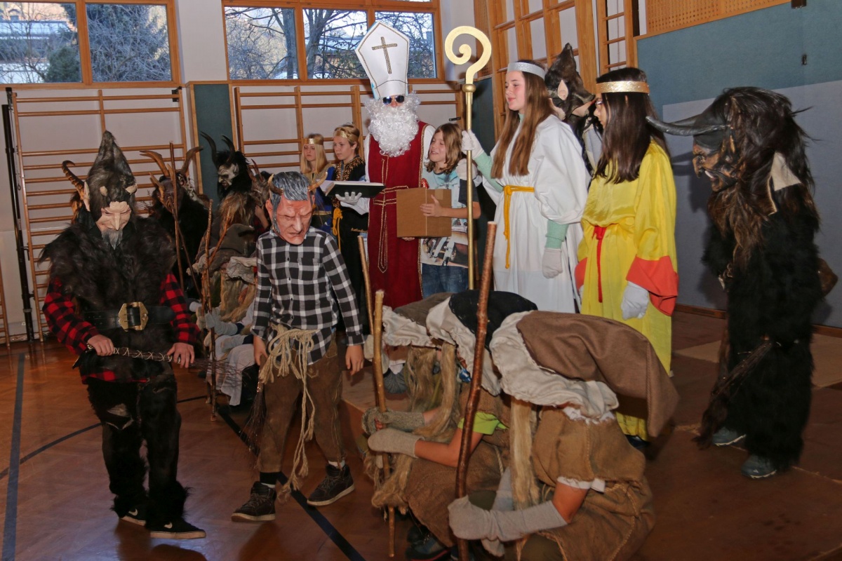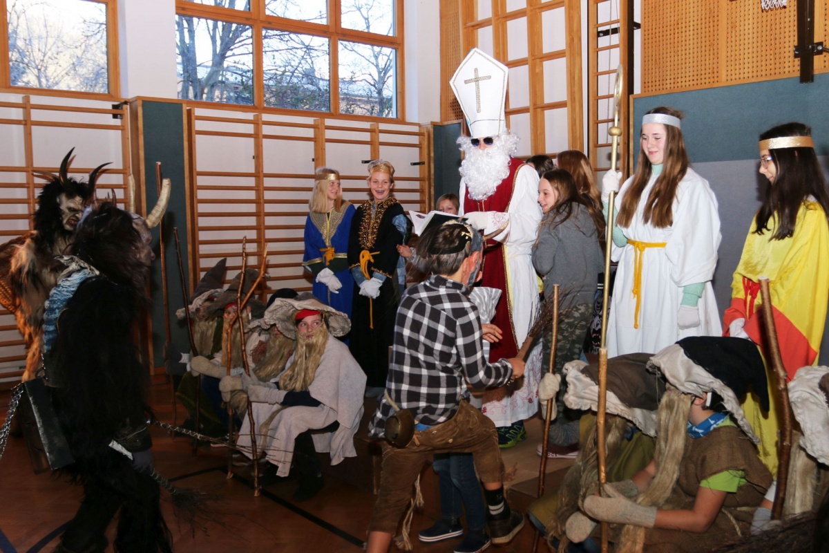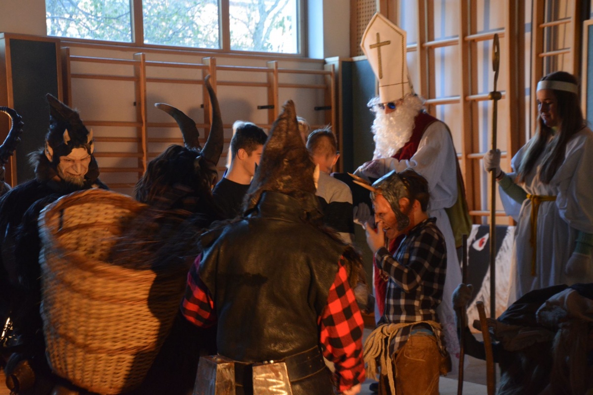 .... kommt der Nikolaus mit seinem Gefolge in unsere Schule. Auch heuer mussten sich die Klassen ihre guten und weniger guten Taten vom Nikolaus S. R. (© mit dunkler Brille) anhören. Zur „Belohnung“ gab es für die KlassensprecherInnen Süßes oder Saures.