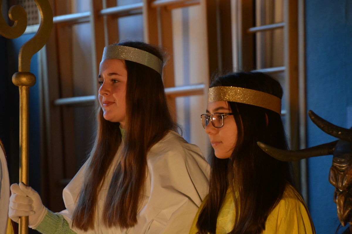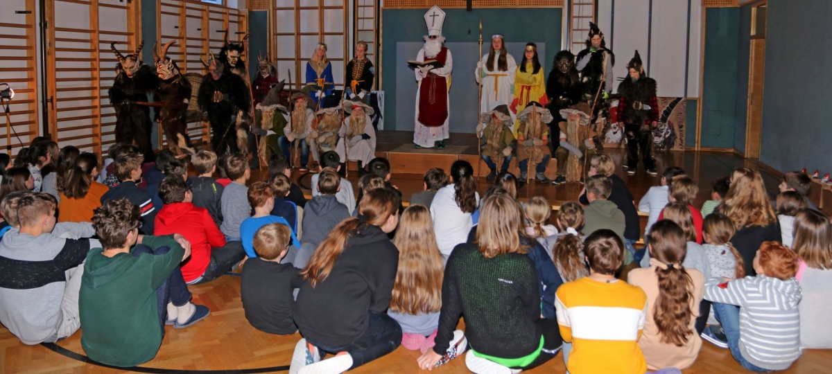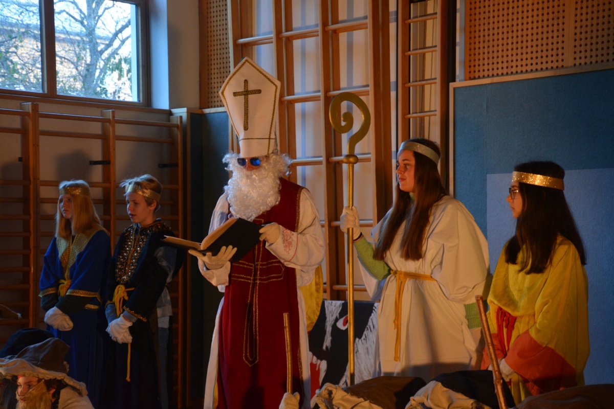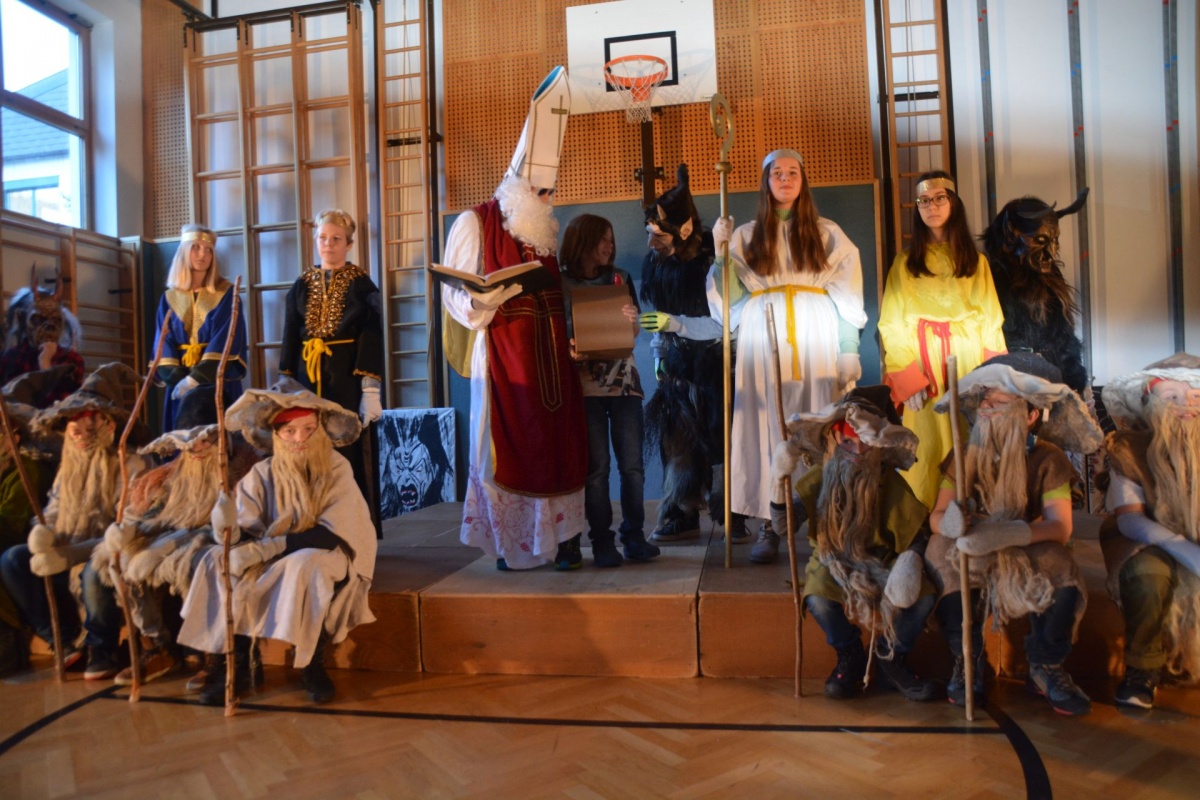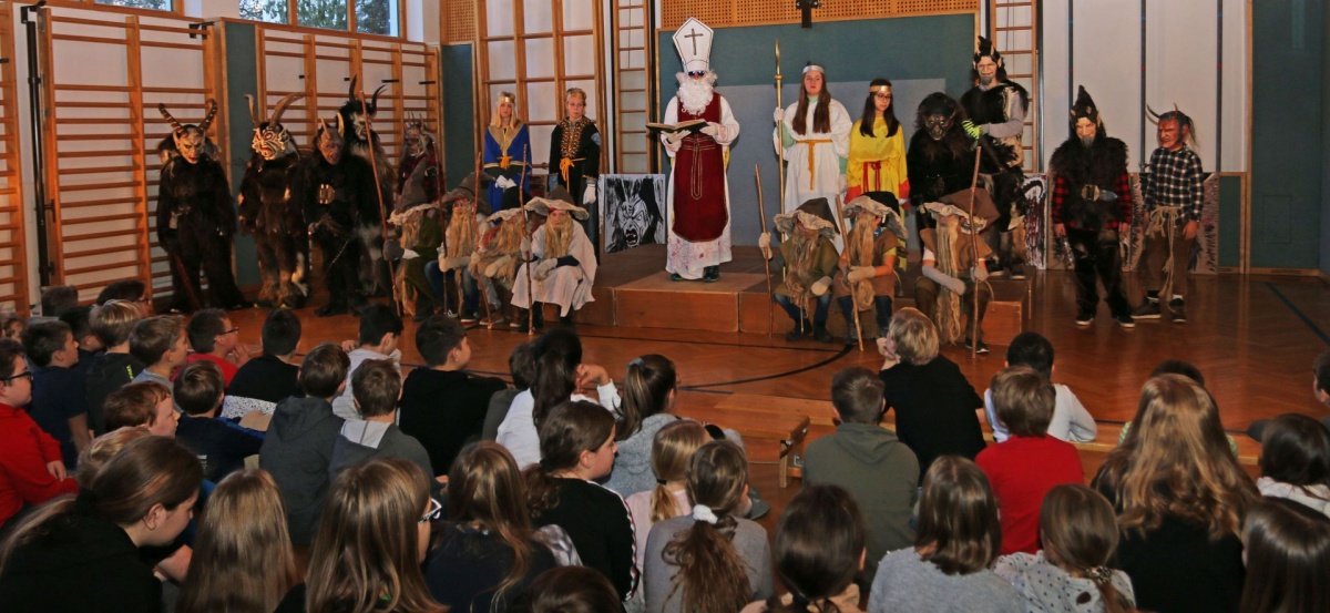 .... kommt der Nikolaus mit seinem Gefolge in unsere Schule. Auch heuer mussten sich die Klassen ihre guten und weniger guten Taten vom Nikolaus S. R. (© mit dunkler Brille) anhören. Zur „Belohnung“ gab es für die KlassensprecherInnen Süßes oder Saures.