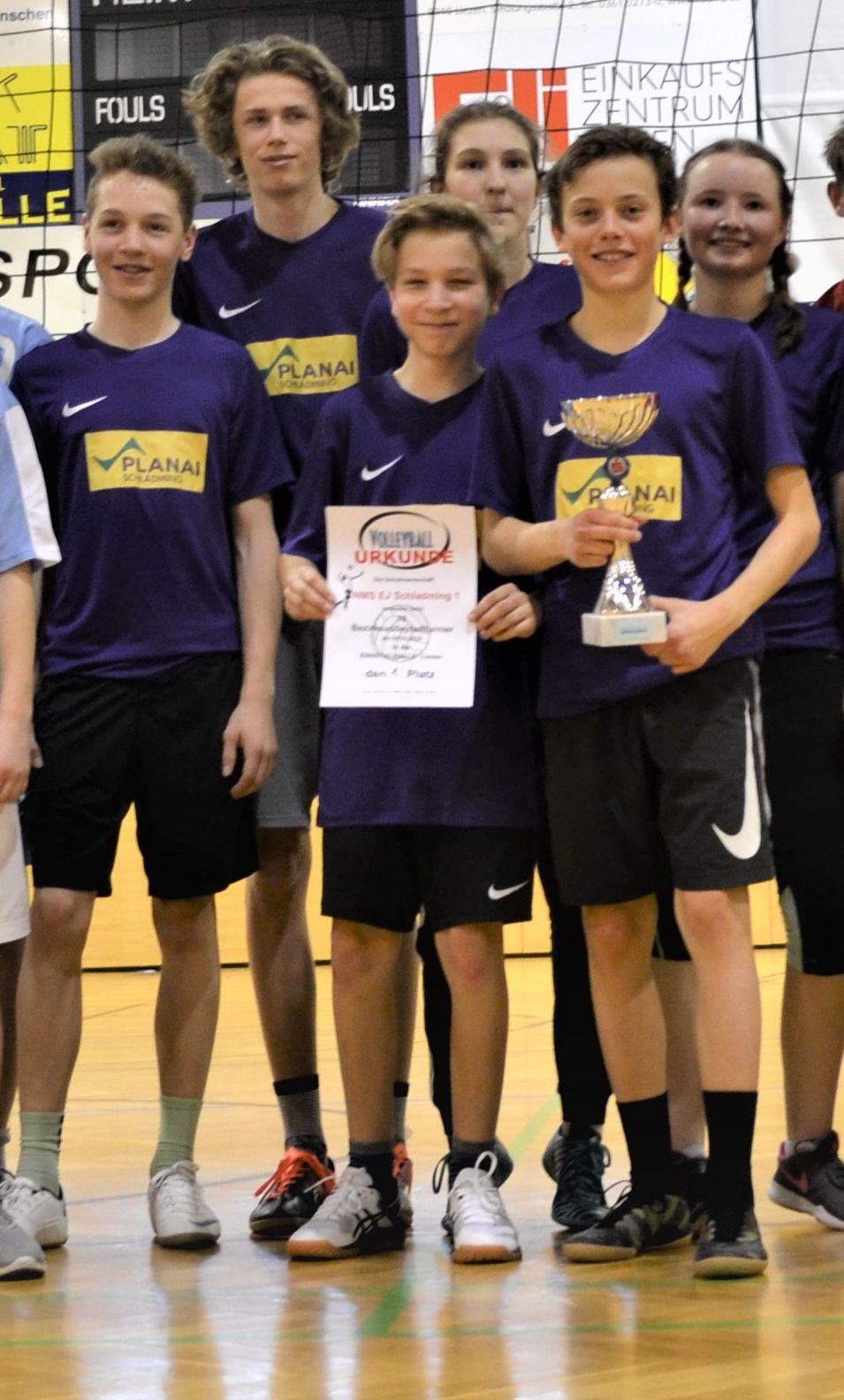 Und tatsächlich: Die A-Mannschaft unserer Schule, bestehend aus Andrea Kesina (3a), Leonie Tritscher (3b), Jürgen Stöffler (3b), Tobias Bauregger, Matteo Wimmer und Kapitän Nick Hofmann (alle 4a), gewann alle vier Gruppenspiele und danach auch noch das Finale gegen das Team des Stiftsgymnasiums Admont.