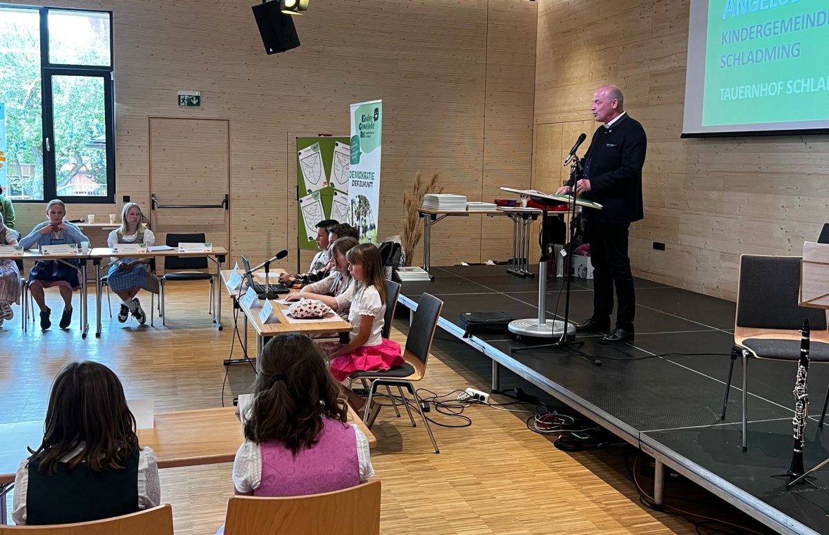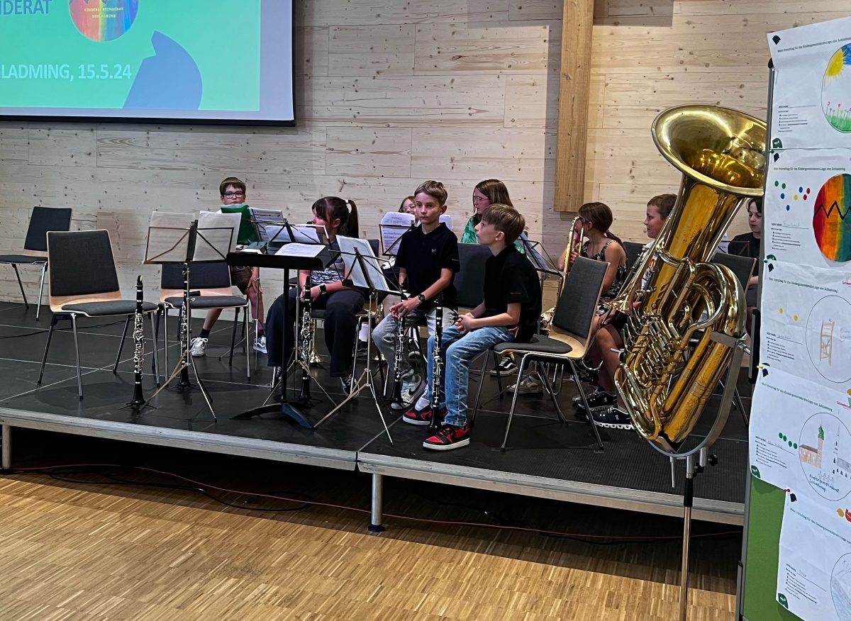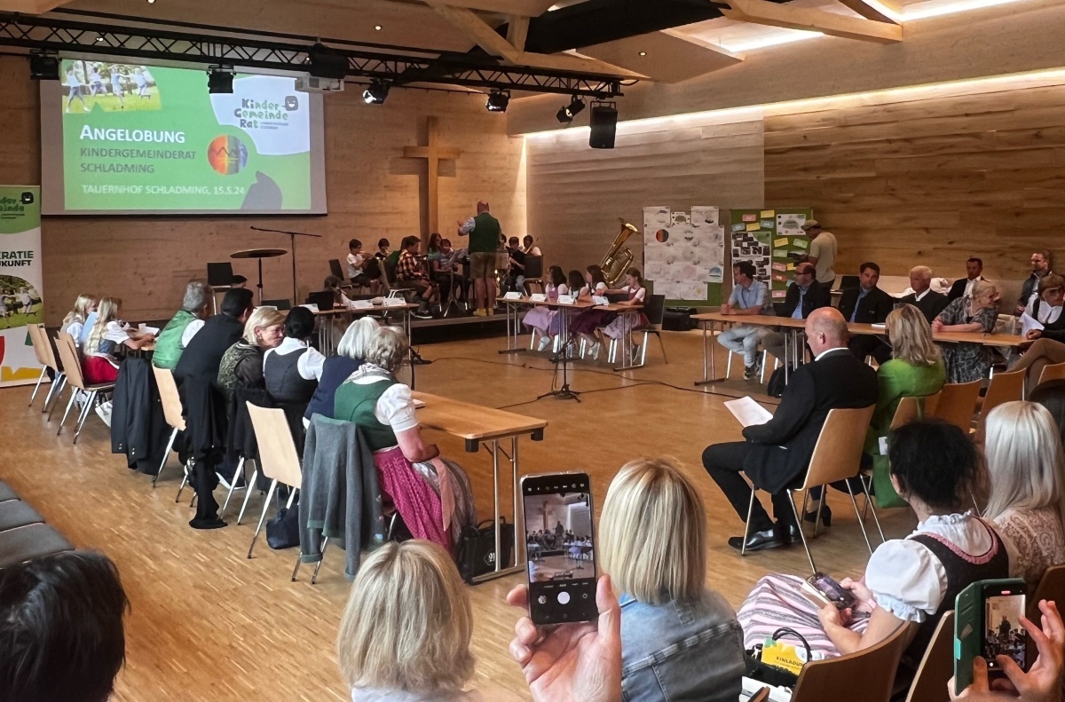 Mit musikalischer Untermalung der Bläserklasse Schladmings zogen die Kindergemeinderäte und Kindergemeinderätinnen am 15. Mai 2024 zur feierlichen Angelobung in den Seminarraum des Tauernhofs in Schladming ein. Im Publikum befanden sich die stolzen Eltern und Verwandte der Kindergemeinderät:innen sowie die Gemeinderäte Schladmings. Die Begrüßung erfolgte durch Bürgermeister Hermann Trinker.