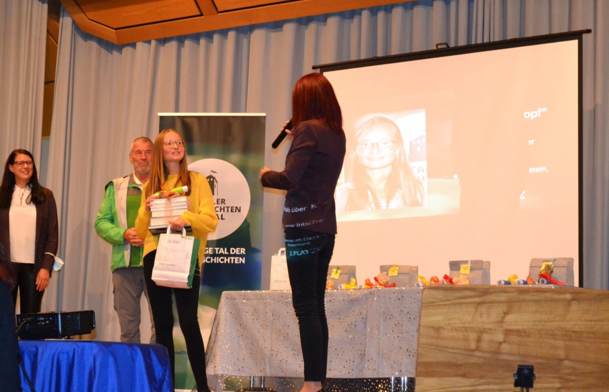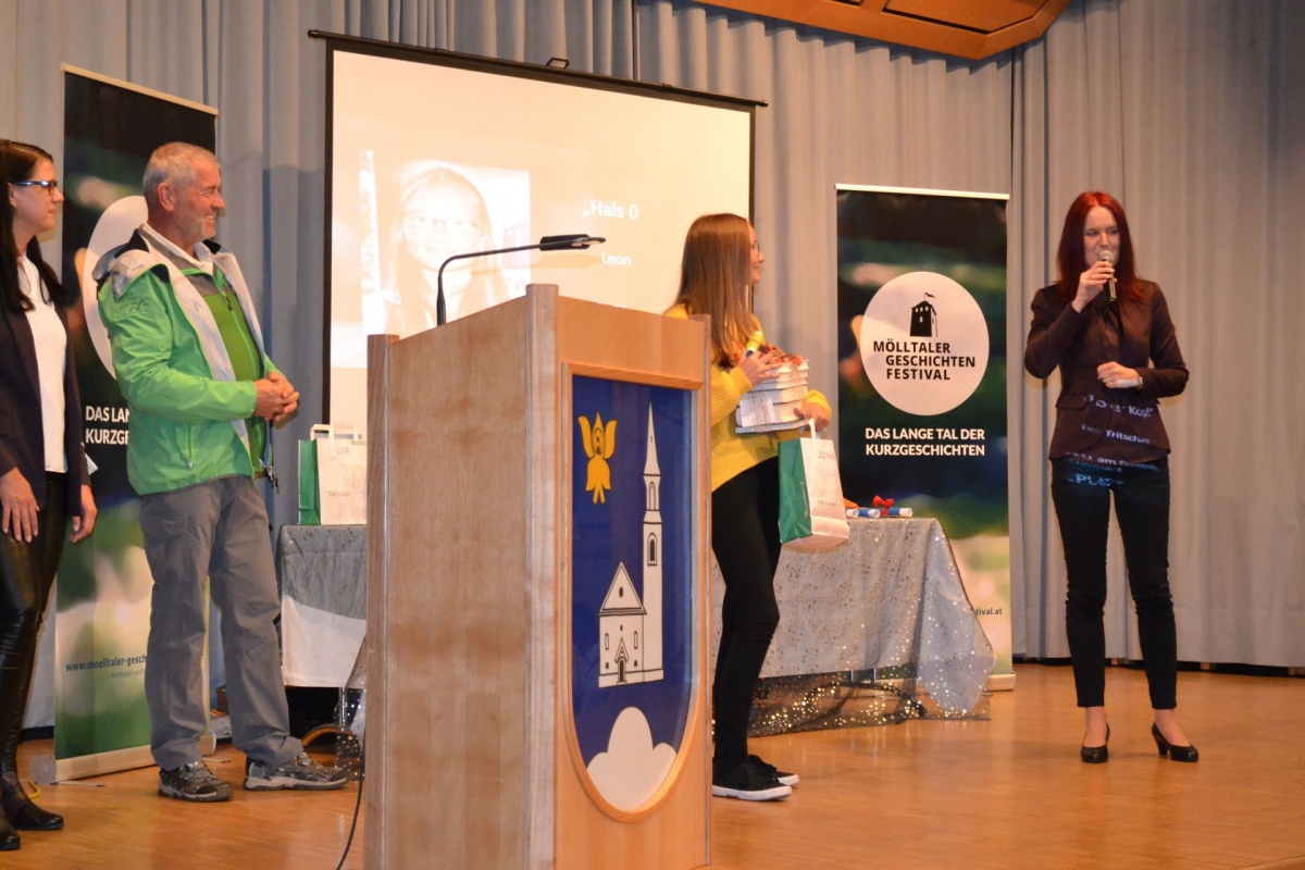 Leonie Tritscher, Schülerin der 4b Klasse der MS Erzherzog Johann Schladming, beeindruckte mit ihrer Kurzgeschichte „Hals über Kopf“ sowohl das Publikum wie auch die Fachjury des Mölltaler Geschichtenfestivals und wurde dafür mit dem 2. Preis in der Kategorie NachwuchsautorIn ausgezeichnet.