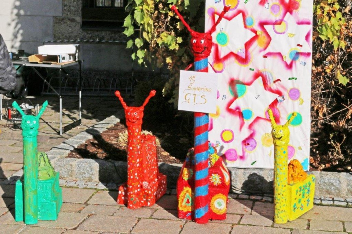 Schöpferisches Gestalten und Freude am künstlerischen Experimentieren bildeten den Inhalt der präsentierten Werke. Von Riesenschnecken der Volkschüler bis zu symbolträchtigen Holz- und Ytong Plastiken, gestaltet von Mittelschülern, von Mal- und Druckarbeiten bis zu Collagen und Mobiles reichte die Palette der Kinderkunstwerke.