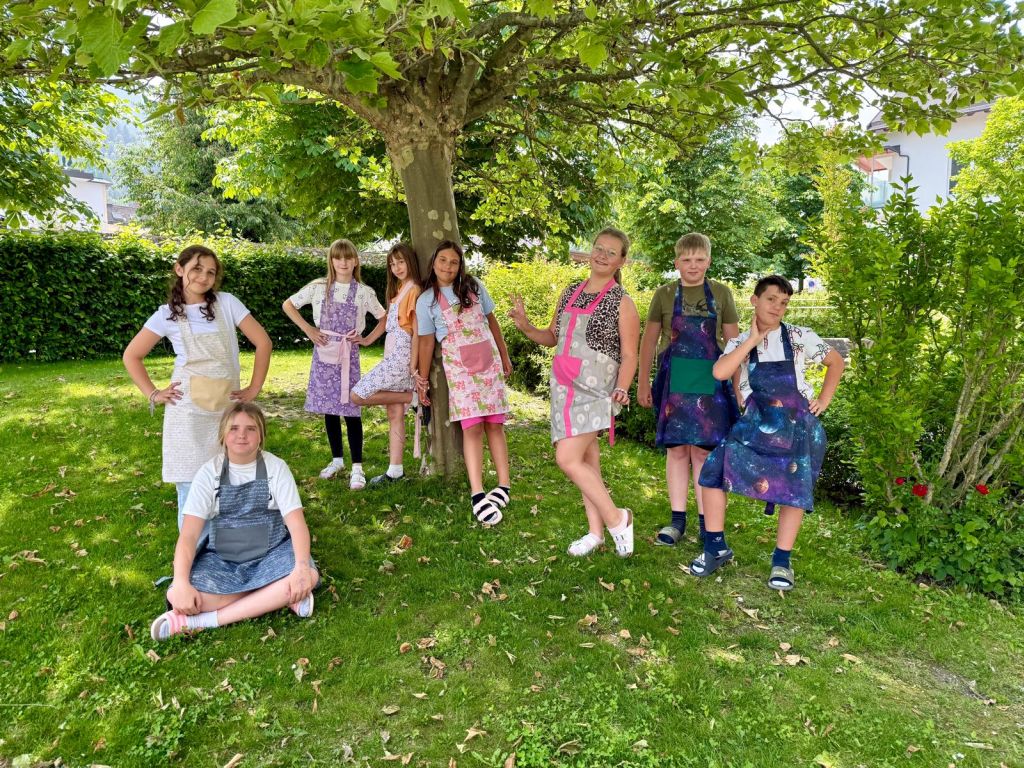 Schülerinnen und Schüler der 1a Klasse präsentieren stolz ihre selbst genähten Kochschürzen, die im nächsten Schuljahr im Unterrichtsfach Ernährung und Haushalt zum Einsatz kommen werden.